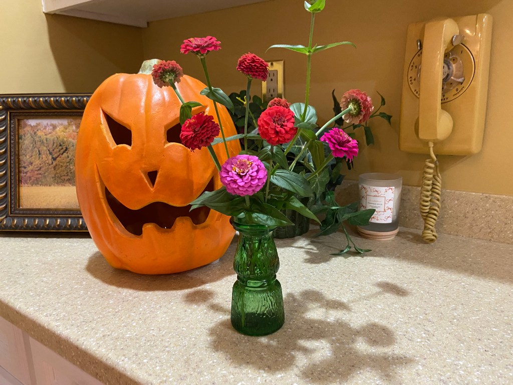 In other fall news, the squirrels–or maybe rabbits?–are at it again: gnawing on my plants. I set out several ornamental cabbages a couple of weeks ago. Some are flourishing; others have been attacked. Arrgggh! I read somewhere that used coffee grounds and bone meal deter critters, so I’ve used both around my plants.