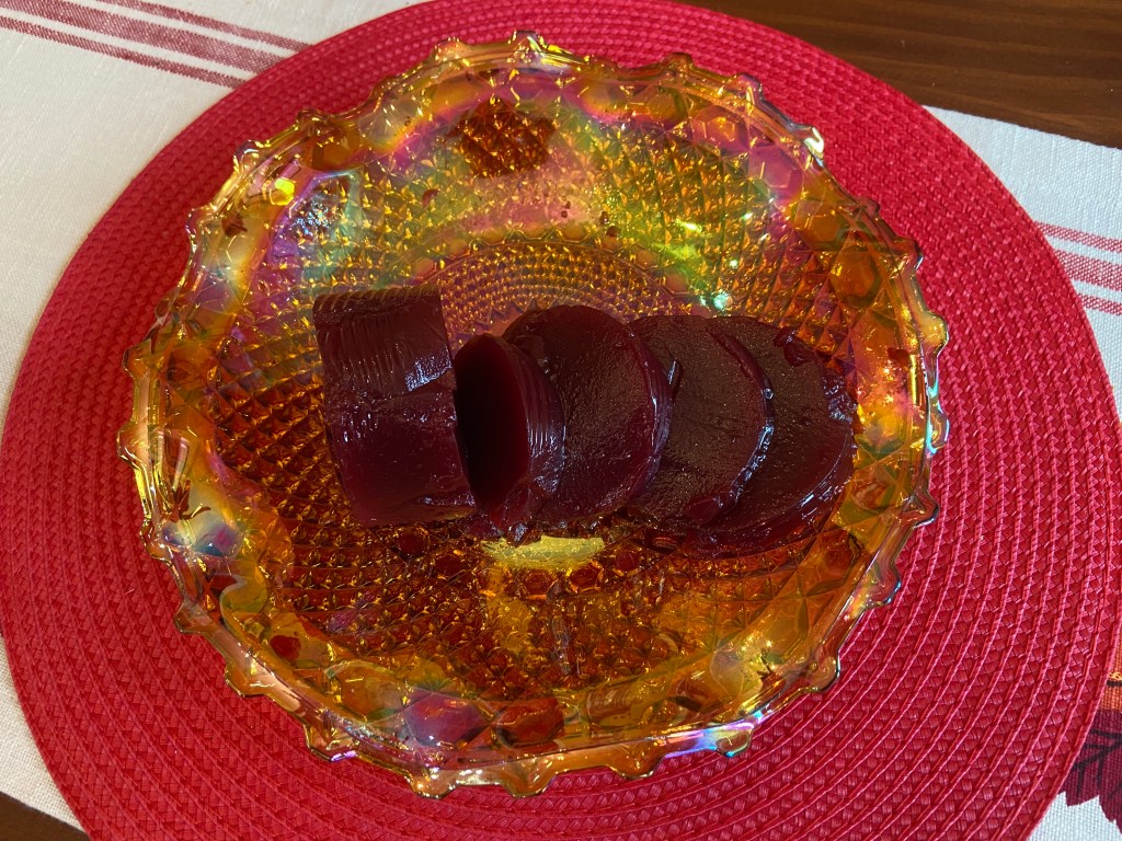 Her cranberry, however, she slid straight out of the can, plopped on a plate, and sliced at the last minute. That jellied, ridged cranberry is one of the two dishes of her Thanksgiving dinner where I think I’ve raised the bar.