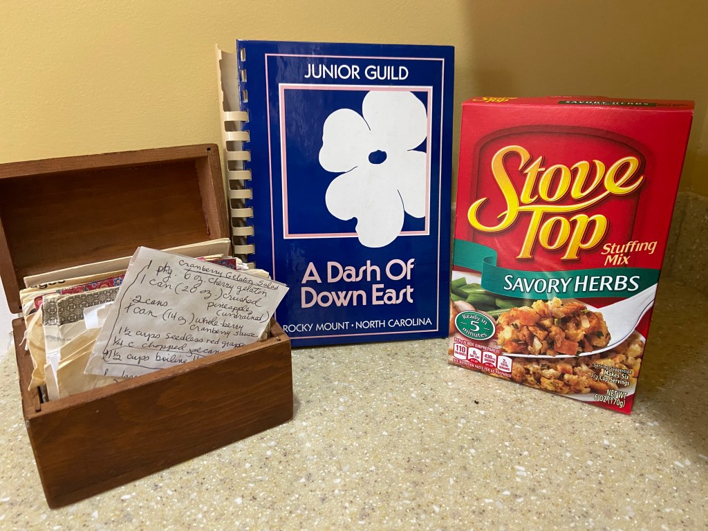 I love the 1986 edition of the Rocky Mount Junior Guild cookbook, A Dash of Down East (in the picture above). It contains real recipes for real people. The sweet potato casserole recipe, my other improvement in Mama’s Thanksgiving menu, comes from this book.