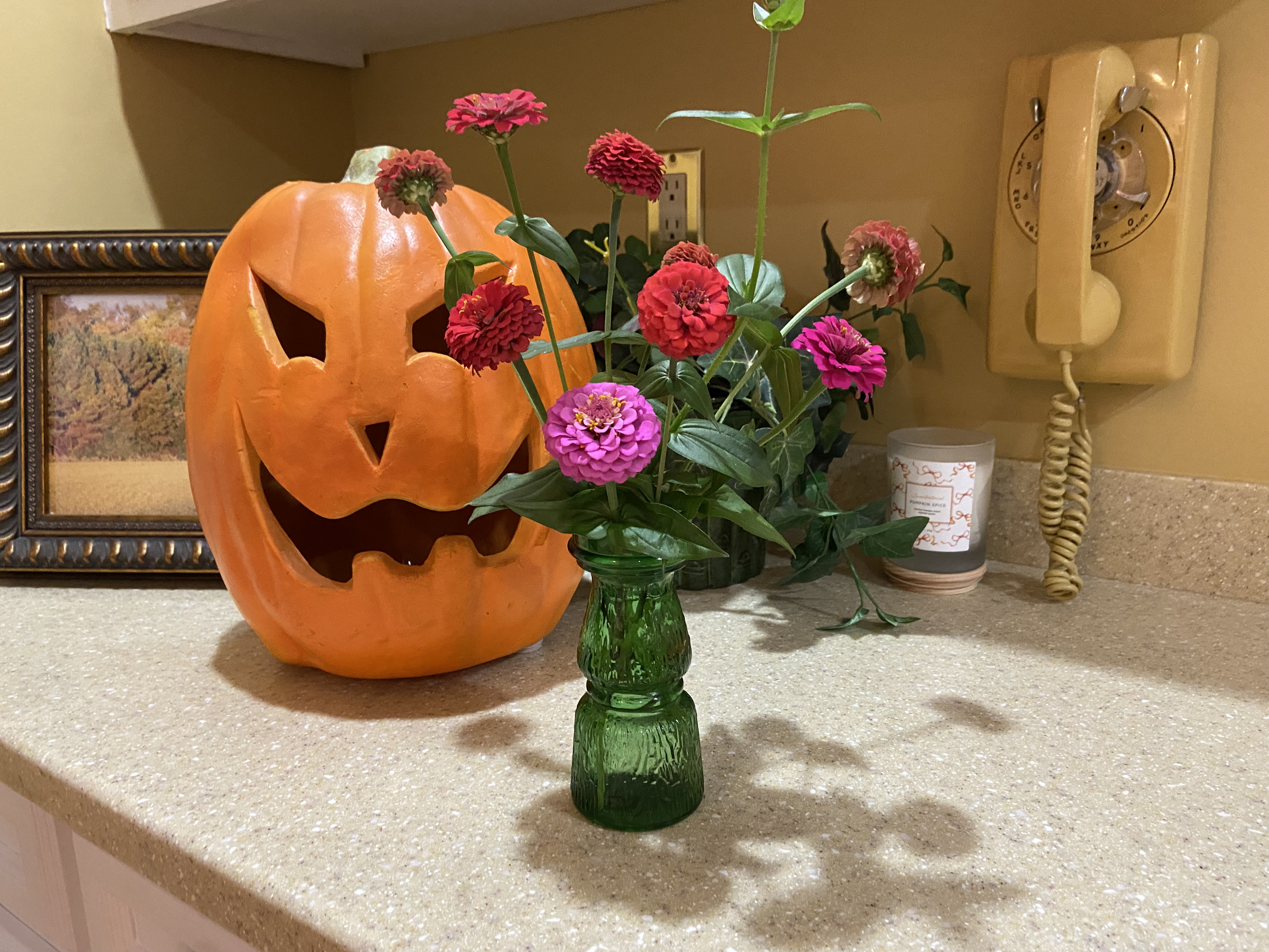 In other fall news, the squirrels–or maybe rabbits?–are at it again: gnawing on my plants. I set out several ornamental cabbages a couple of weeks ago. Some are flourishing; others have been attacked. Arrgggh! I read somewhere that used coffee grounds and bone meal deter critters, so I’ve used both around my plants.
