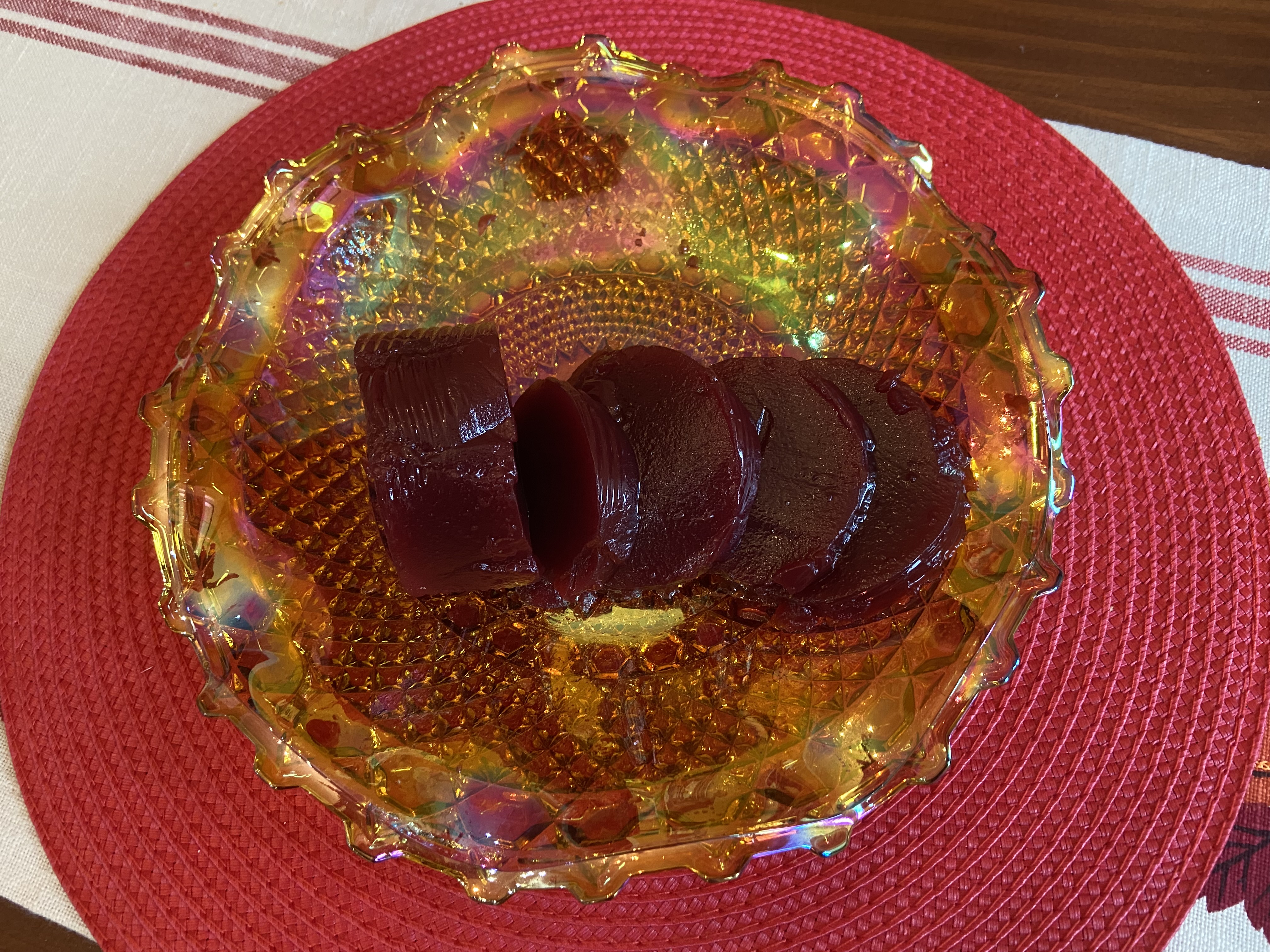 Her cranberry, however, she slid straight out of the can, plopped on a plate, and sliced at the last minute. That jellied, ridged cranberry is one of the two dishes of her Thanksgiving dinner where I think I’ve raised the bar.