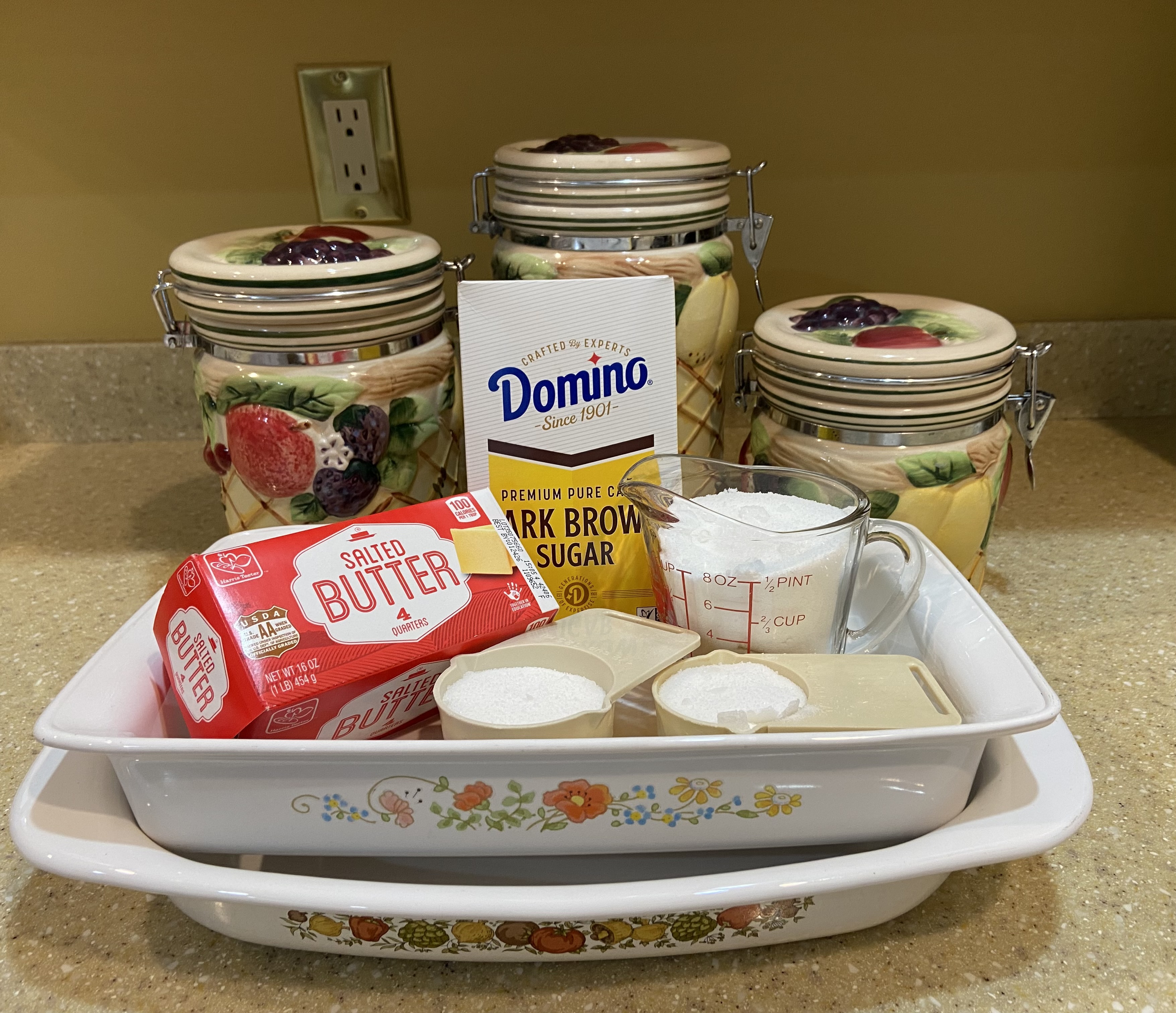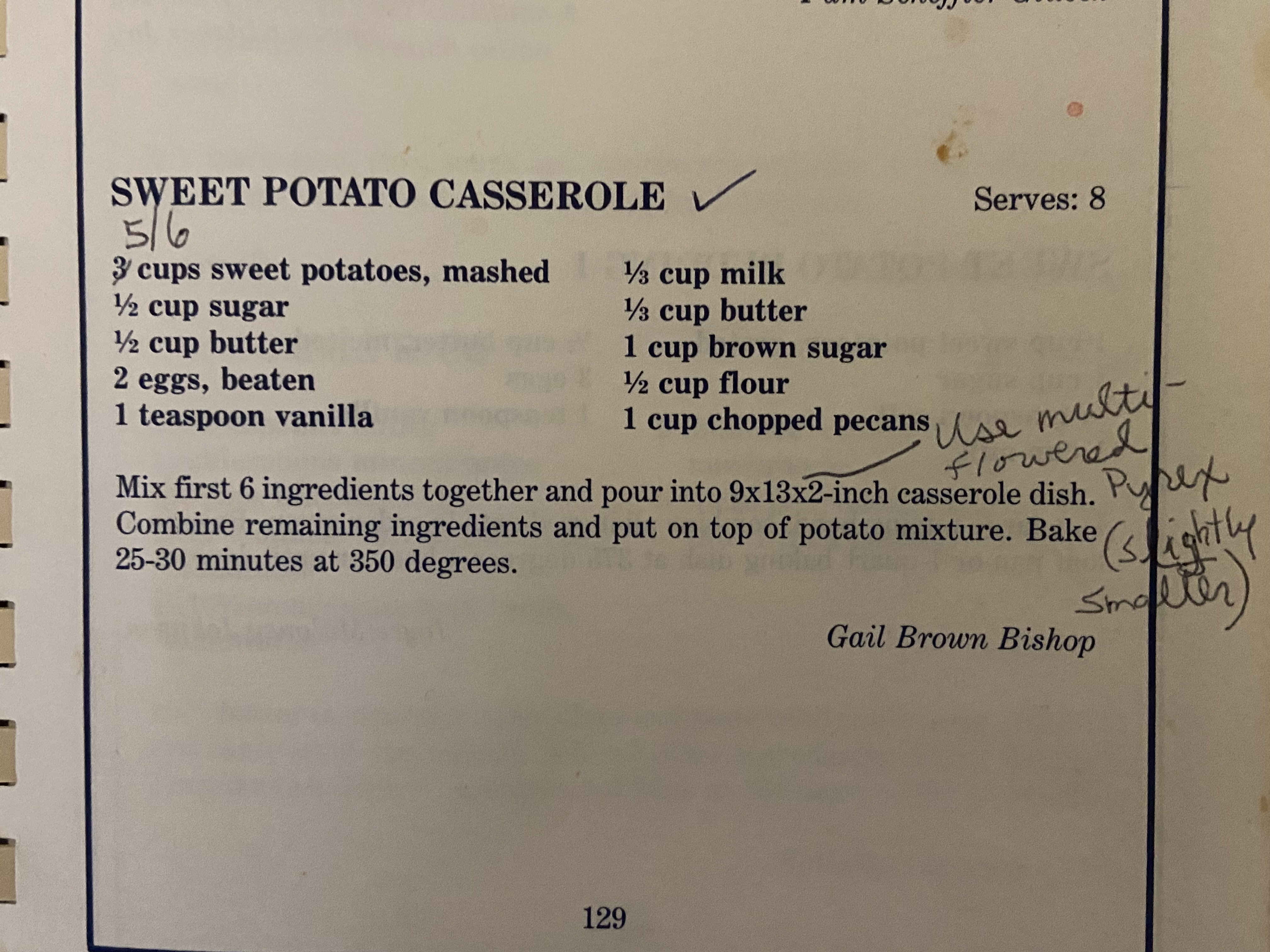 As you can see, I’ve upped the number of sweet potatoes to use and made myself a note as to which casserole dish to use each year. Thank you, Gail Brown Bishop, for this recipe. You’ve saved me from melted marshmallows on plain sweet potatoes.