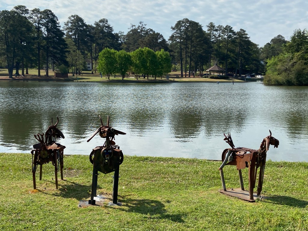 City Lake has undergone renovations over the years, with a complete beautification project in 1993. Today, there’s a half-mile walking trail circling the lake, a gazebo, and a fountain. Whimsical metal sculptures have been added in recent years.