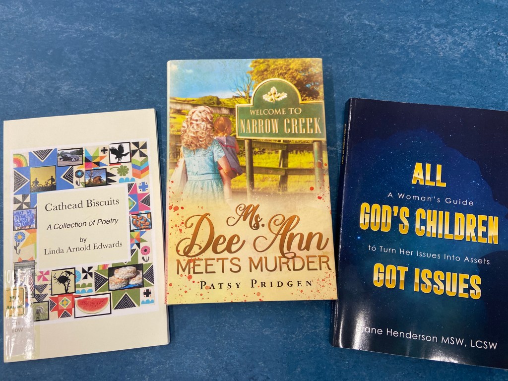Sound terrifying? Not really. We’re a nonjudgmental group. We laugh a lot. We even give everyone there an opportunity to read something they’ve written before the meeting. For example, I’ve shared parts of Ms. Dee Ann Meets Murder, as well as the sequels I’m working on. I’m not the only published author in the group. Linda Edwards has compiled her poems in Cathead Biscuits, and Diane Henderson’s self-help book All God’s Children Got Issues is available on Amazon Prime.