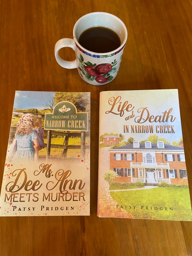 And now there are two. Ms. Dee Ann Meets Murder has been joined by Life and Death in Narrow Creek. I see postings of books all the time next to a cup of coffee, so that’s why my morning shot of 100% Colombian Folgers is in this picture.