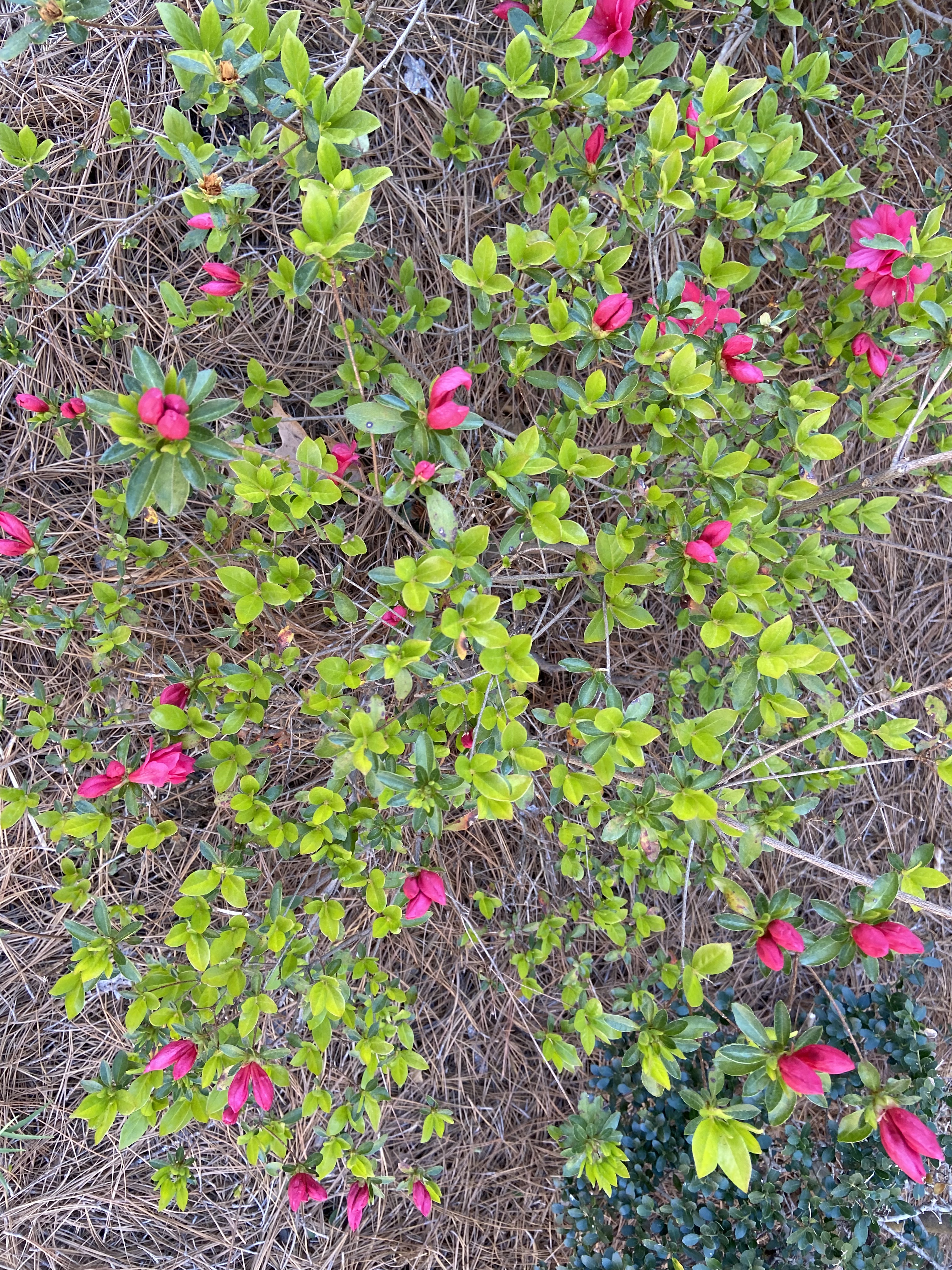 I have different types of azaleas, so my yard is a rainbow of colors ranging from pink to white to purple to red. A hodge-podge which reflects my tendency to buy azaleas on impulse. In addition to different hues, I get different blooming times, which helps to stretch the season.
