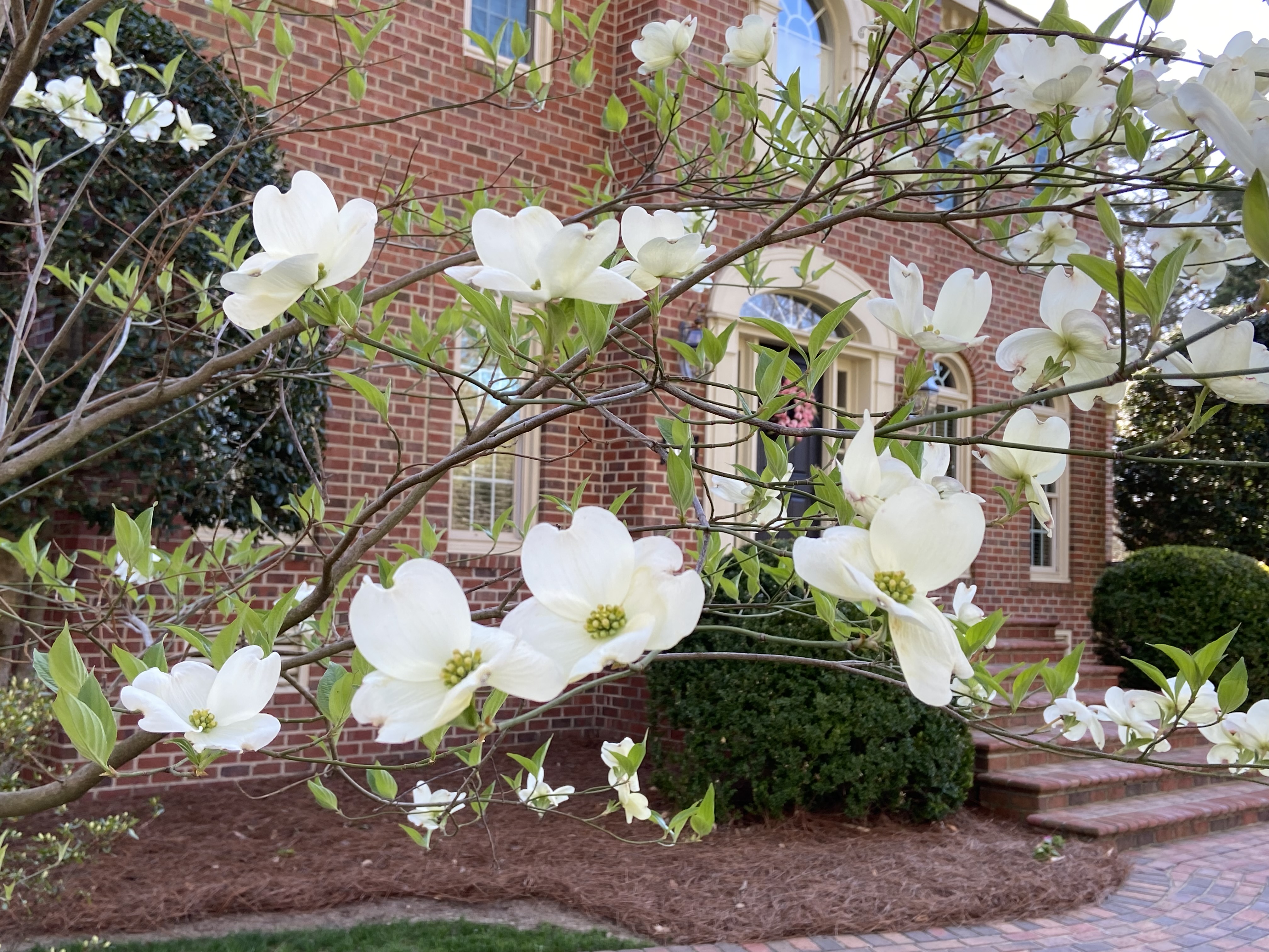 My never-say-die dogwood is lovely right now. I bought this tree as a sapling years ago when Home Depot was in Rocky Mount. My husband has cut dead limb after dead limb from it, pronouncing it a goner many times. It always rejuvenates. Given the story of the dogwood, that Christ’s cross was made from its wood, this new birth each spring seems appropriate.