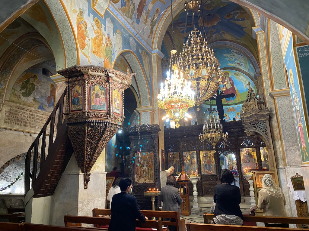 I’ve shown you how this day of travel ended, but let me back up and talk about what I saw before arriving in Jerusalem. The first stop of the day was at the Greek Orthodox Church of the Annunciation in Nazareth, built at the site where the angel Gabriel first appeared to Mary. Here’s how the book of Luke describes this encounter:
