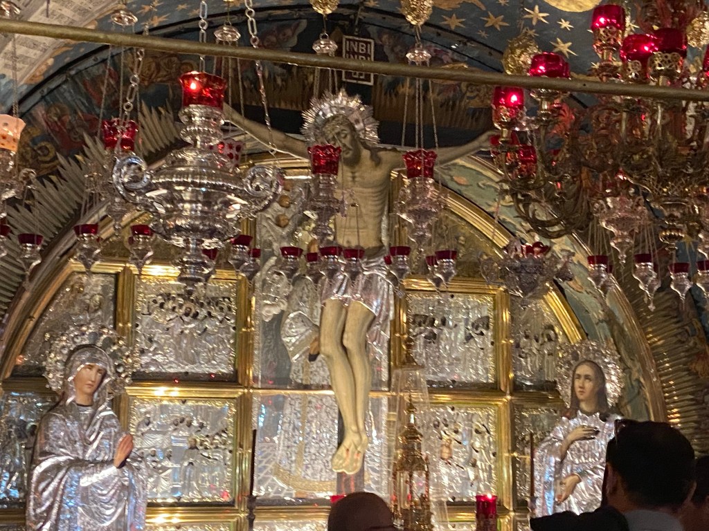 The Church of the Holy Sepulchre is located on the site where many believe Jesus was crucified and buried. The area below this elaborate depiction of the crucifixion is where the cross stood.