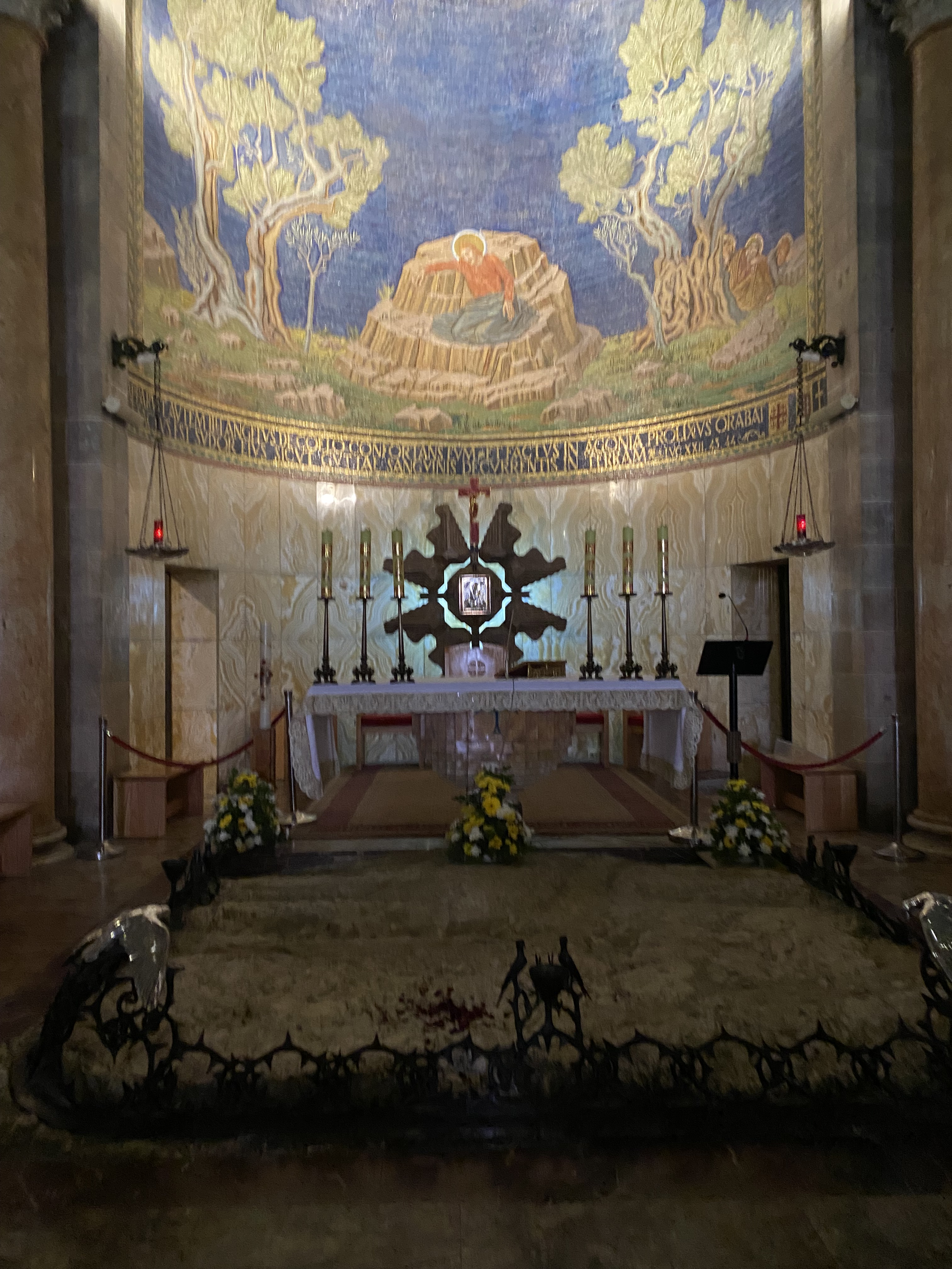 The Church of the Agony, built at the foothills of the Mount of Olives, contains a large flat stone thought to have been the place Jesus spent praying the evening before his crucifixion. Above the stone is a painting depicting this scene.