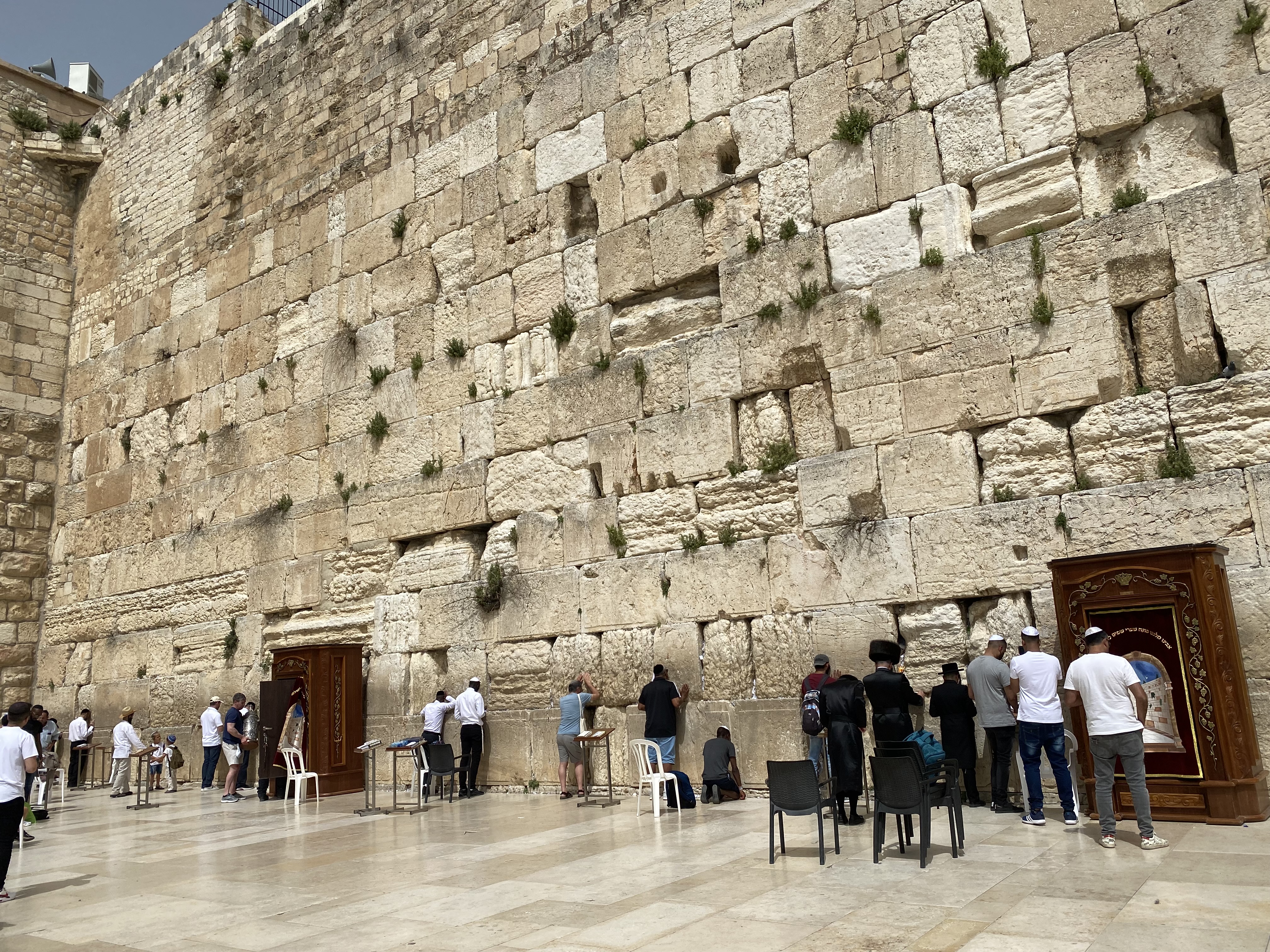 Men and women have segregated sections of the wall for prayer. Male visitors must wear either a Hasidic Jewish hat or the yarmulke. Those without (such as my husband) are given a yarmulke to wear before being allowed to enter the male-only side of the wall. Many visitors to the wall tuck prayer requests written on scraps of paper into the cracks.