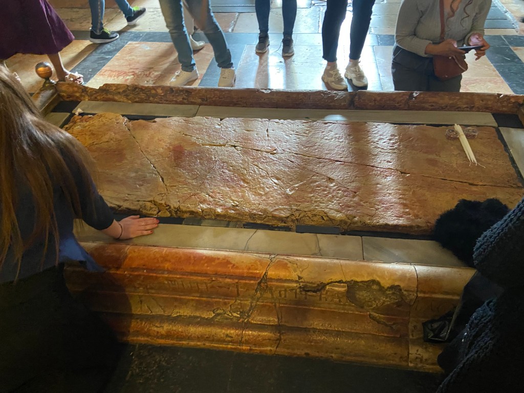 This slab of stone, called the Stone of Anointing, is thought to be where Jesus’ body was laid as it was prepared for burial. Many people pray here and lay hands on the stone, asking for blessings.