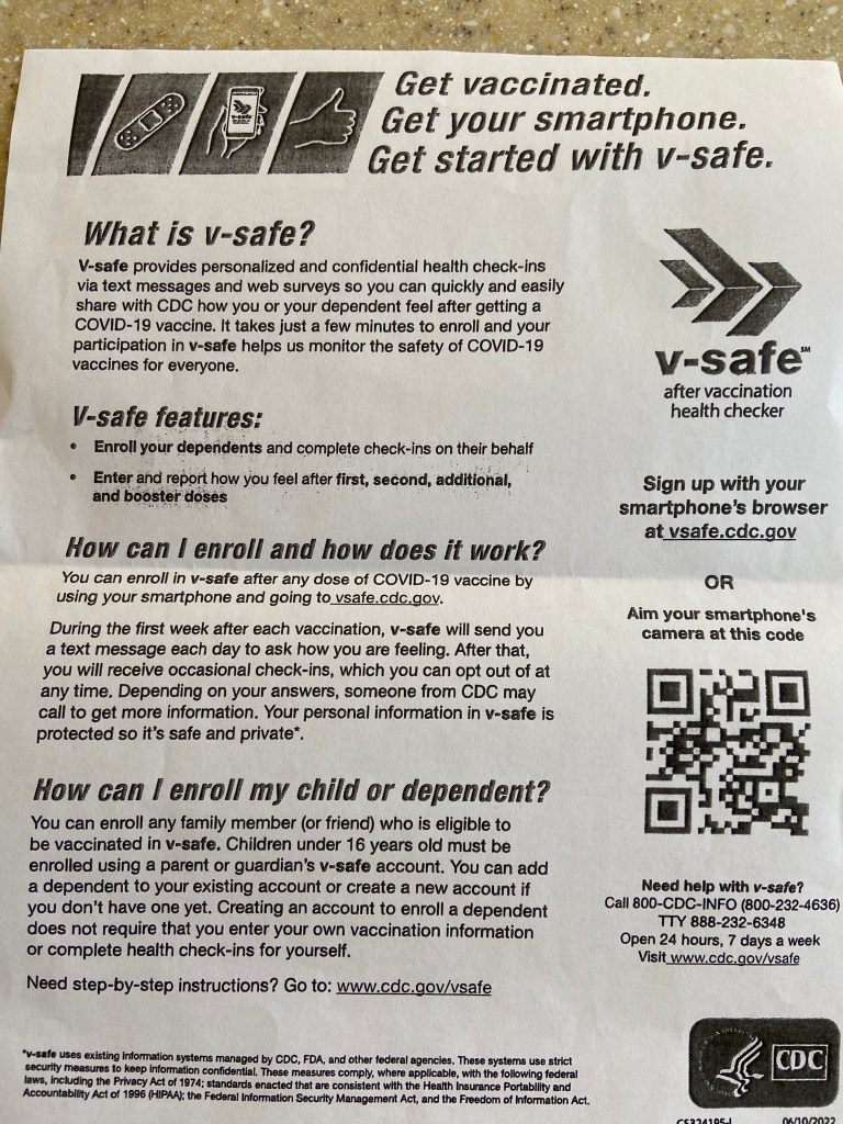 Don’t read the whole thing unless you feel compelled to do so. Instead, zero in on the second bulleted item, the one that says, “Enter and report how you feel after first, second, additional, and booster doses.” And the sentence above the bulleted items that ends with “your participation in v-safe helps us monitor the safety of COVID-19 vaccines for everyone.”