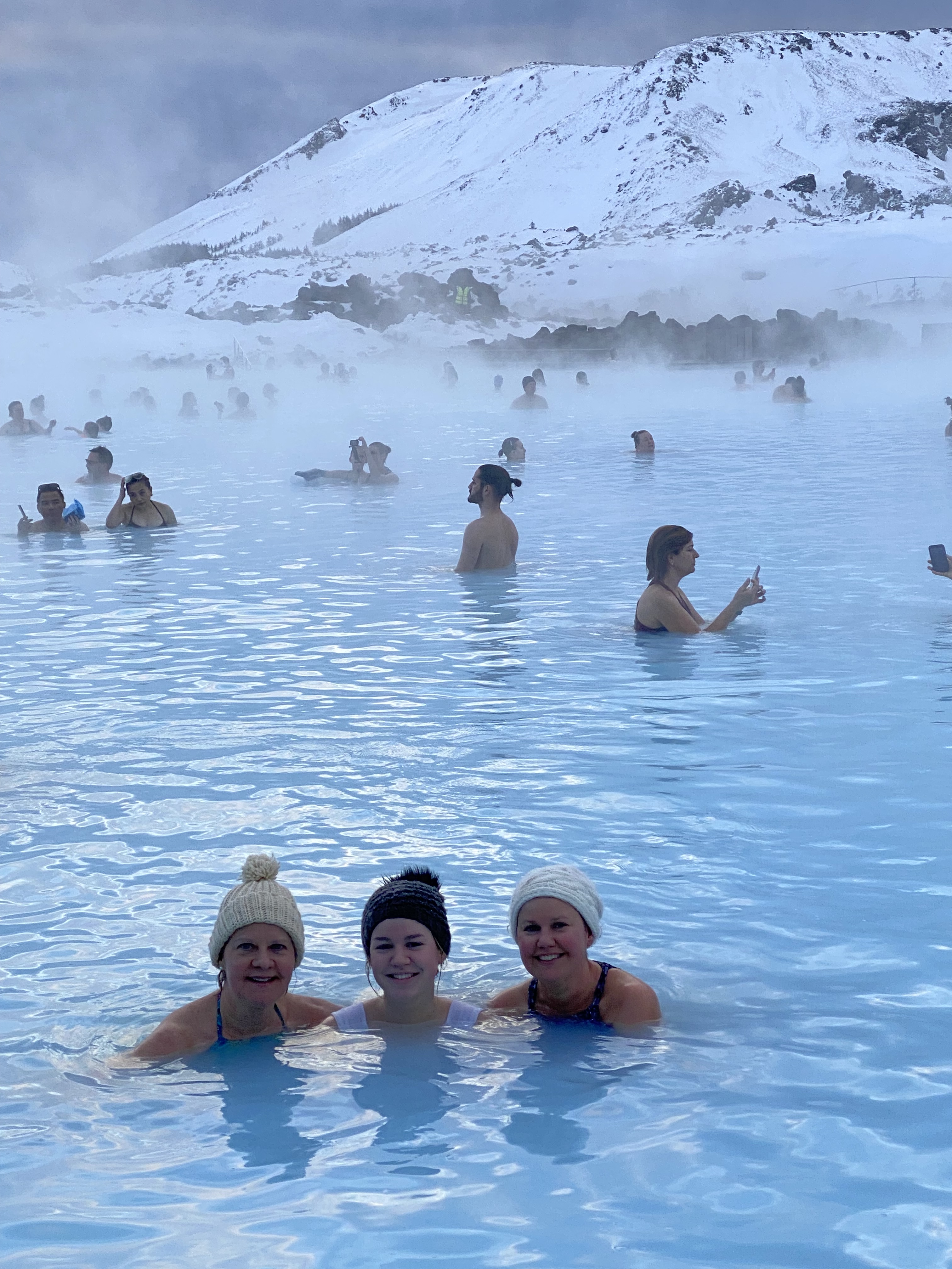 One of our favorite excursions was the trip to the Blue Lagoon, Iceland’s number one tourist attraction. The Blue Lagoon is a large heated geothermal pool “rich with silica and soothing for your skin.” We slathered up with a complimentary mud mask and an adult beverage (except for the underage granddaughter who had a healthy smoothie of some sort). Relaxing!