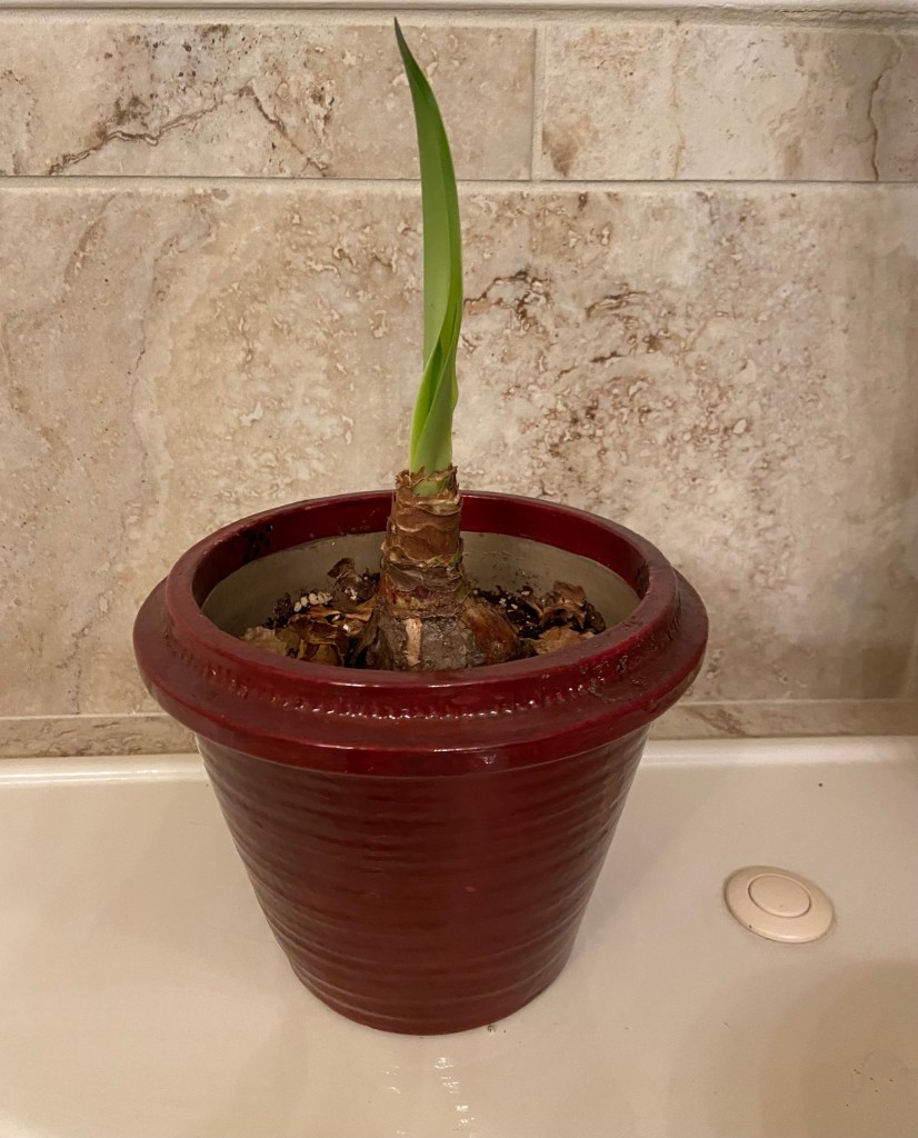 The amaryllis bulb I planted in a pot and put indoors in November, naively thinking it would bloom by Christmas, has only a shoot that looks similar to those on the daffodils outside. I bought this bulb, which was dug out of someone’s yard, at a garden club sale. Evidently, I should buy one of those waxed types sold in the big box stores if I want a flowering amaryllis during December. I think the bulb likes the light and the humidity in my bathroom, though.
