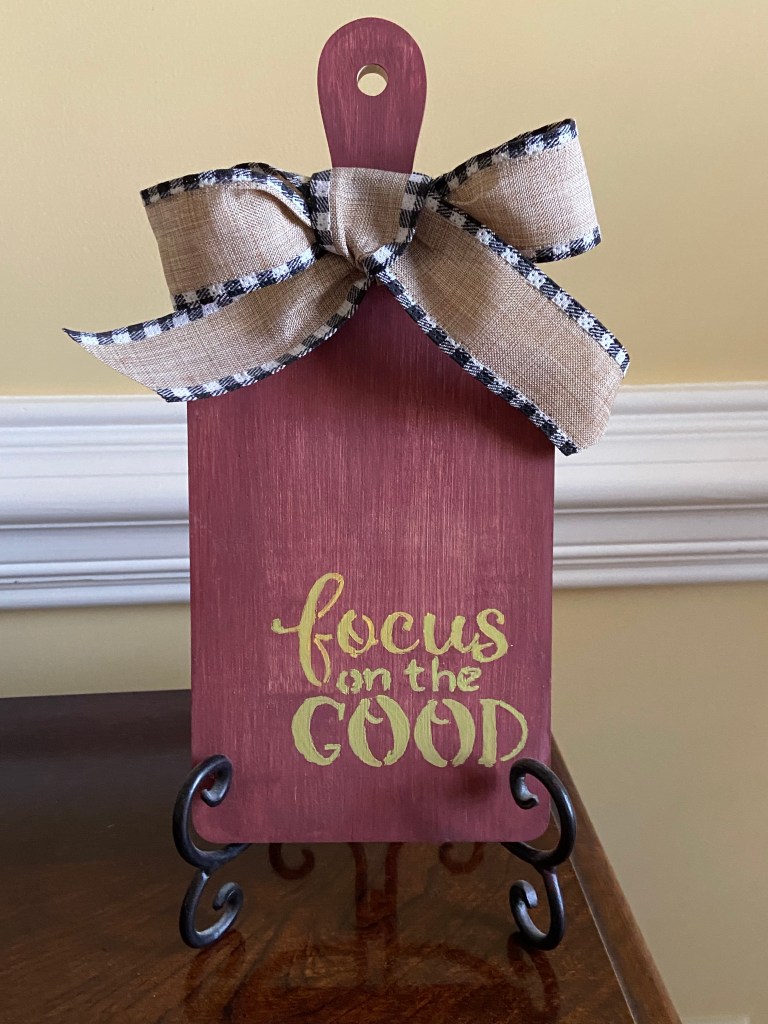 The start of a new year falls within the twelve days of Christmas, and so as tradition would have it, I need to pause this week and consider resolutions. I stenciled a small cutting board at a ladies’ luncheon this past summer, the sort of thing women often feel compelled to do at these events. Once home with it, I almost relegated my not-so-great result to a closet, but instead, I put it on a table in my bedroom where I see it every day.