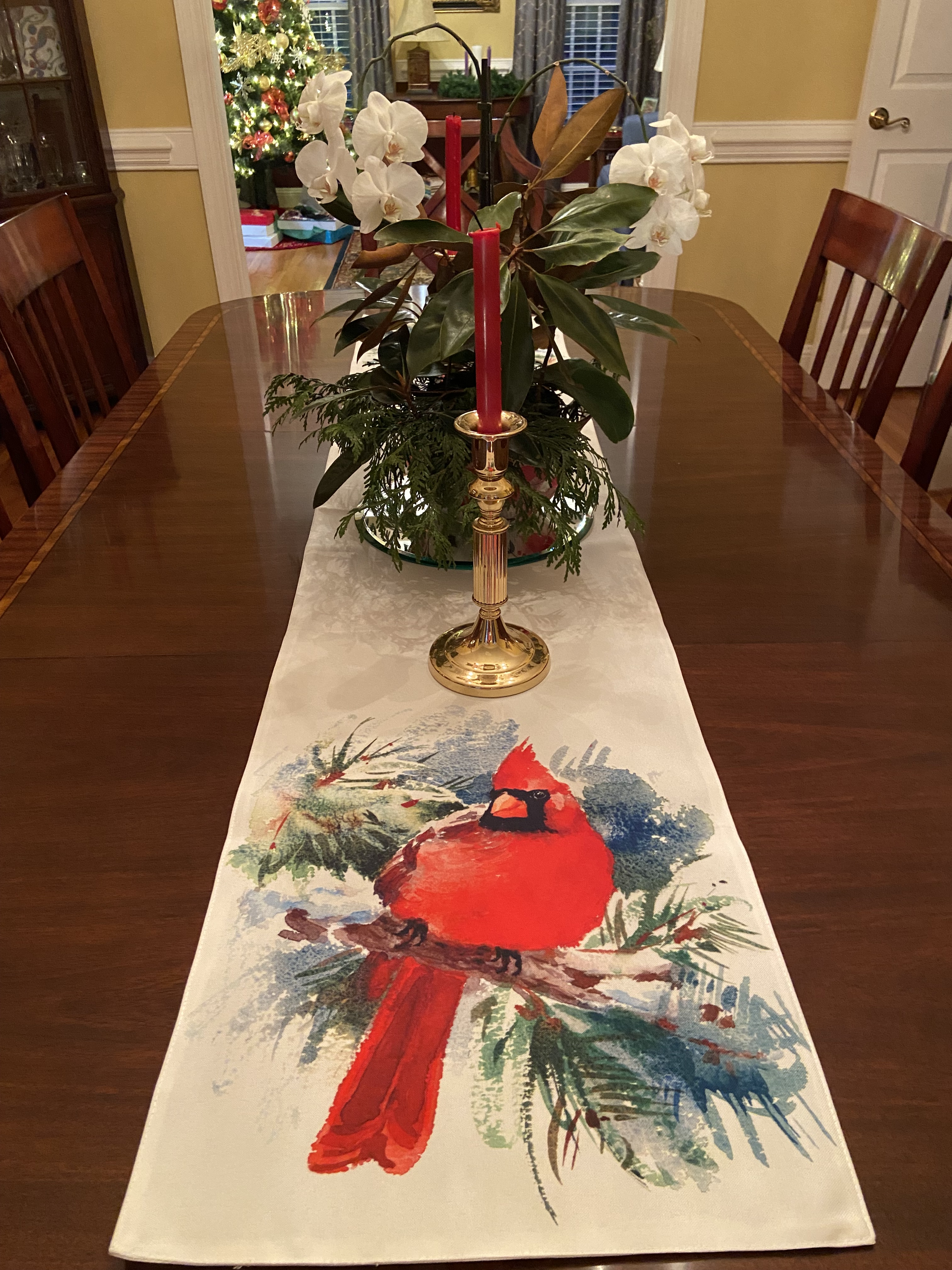I did change the runner with the Christmas tree design in the dining room, mainly because I want to enjoy the redbird pattern for a while.