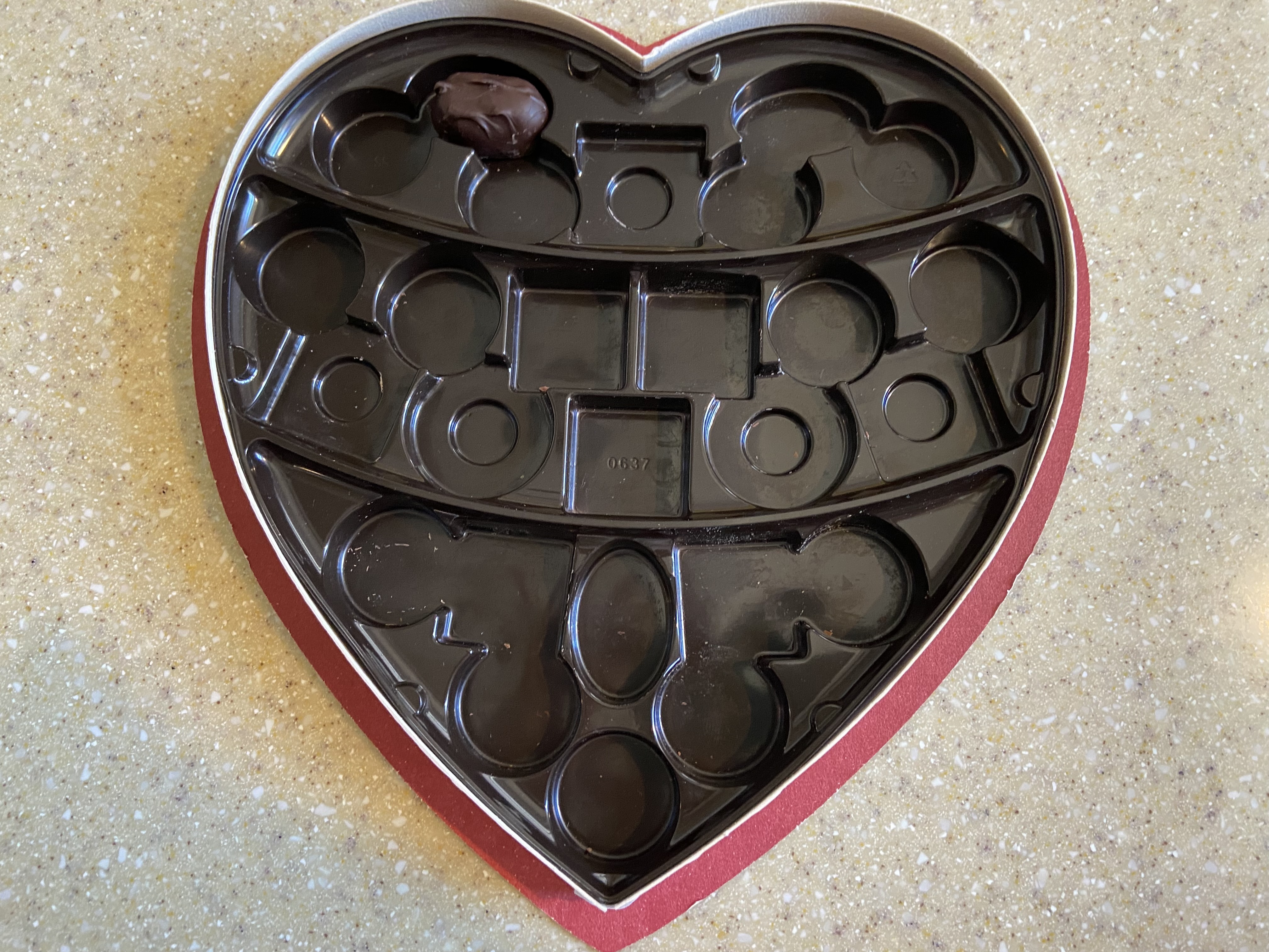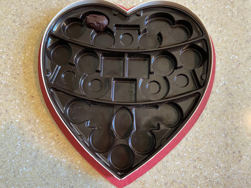 What with my anniversary and Valentine’s Day, I get spoiled in February. I just enjoyed a box of assorted chocolates a couple of weeks ago–except for those with the cream centers, which my sweet husband volunteered to eat. (Note: I left him four or five, but he’d eaten all but one before I could take this picture.)