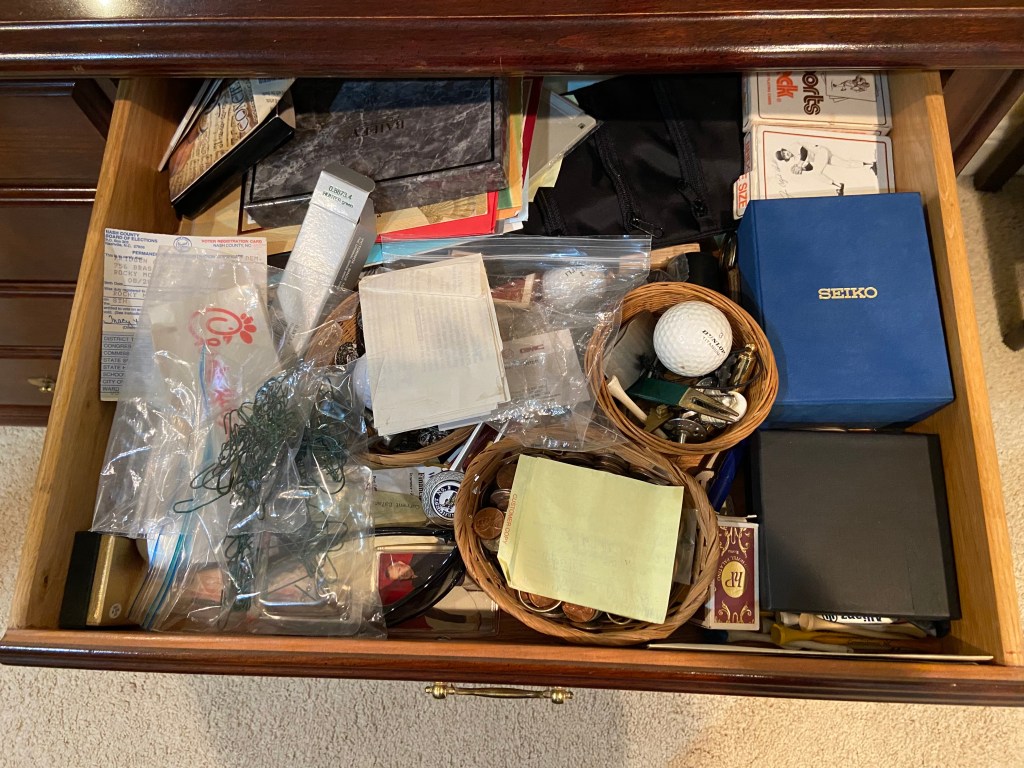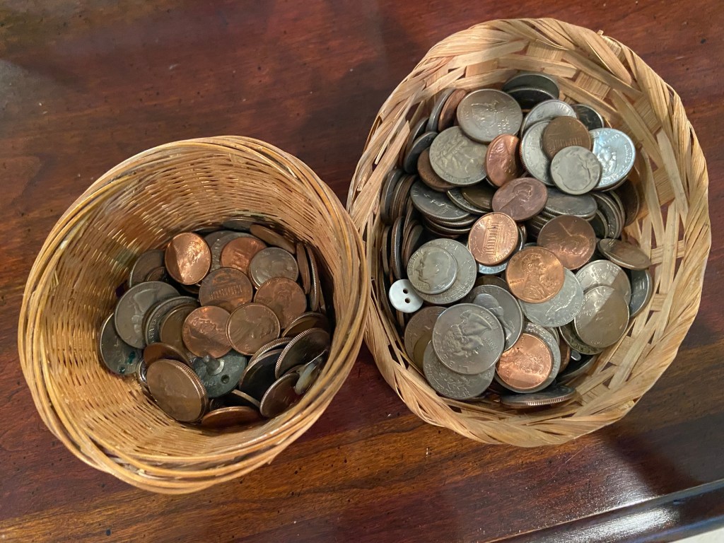 See these two small wicker baskets full of coins that were in the drawer? What’s interesting to me is the number of pennies in each. I plan to hoard them since I recently wasn’t given the three cents due me in change at Dollar General.