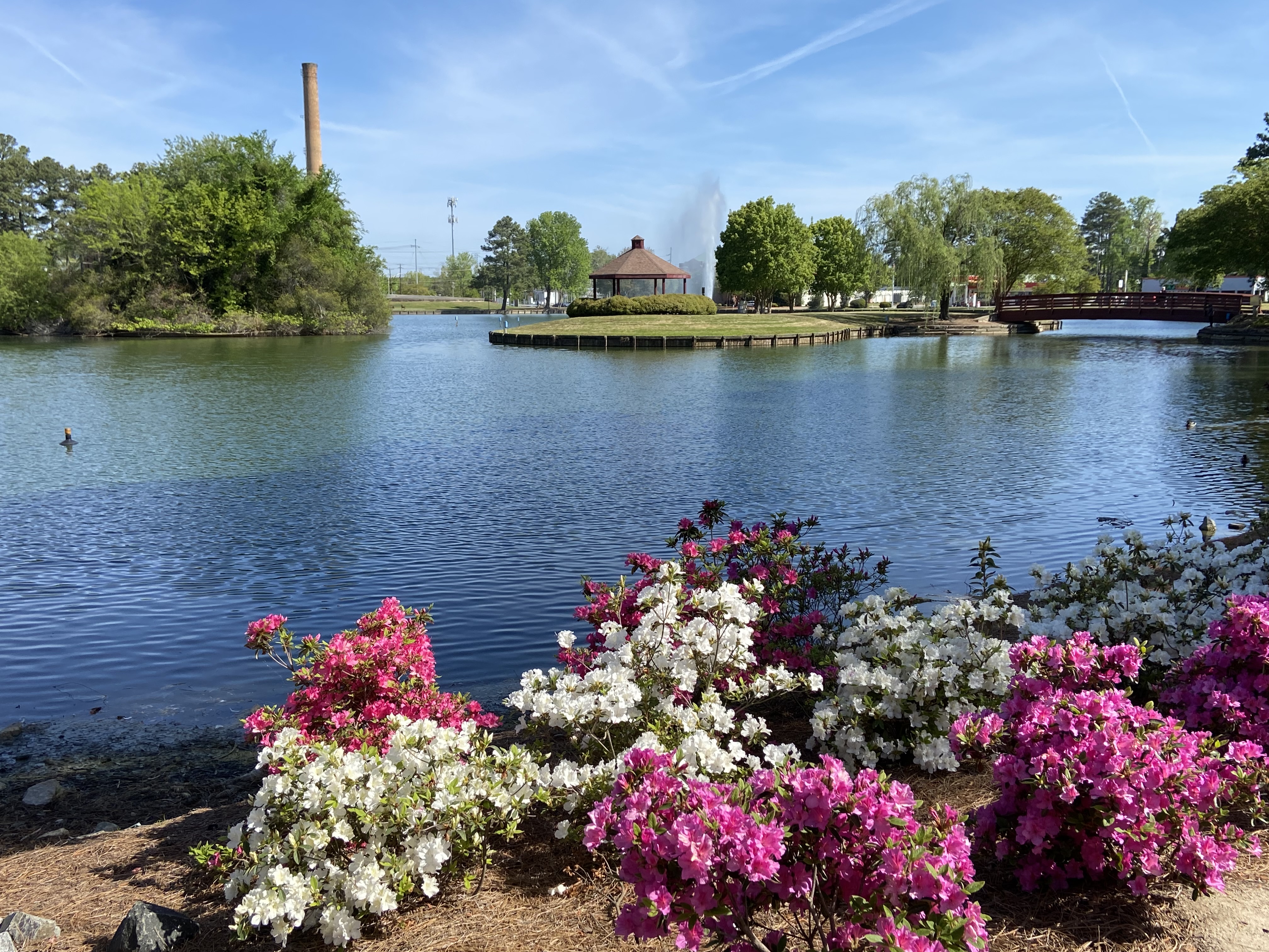 Our broke town couldn’t afford to light up City Lake for Christmas this year, but Mother Nature has taken care of spring decorations. Look at the azaleas.
