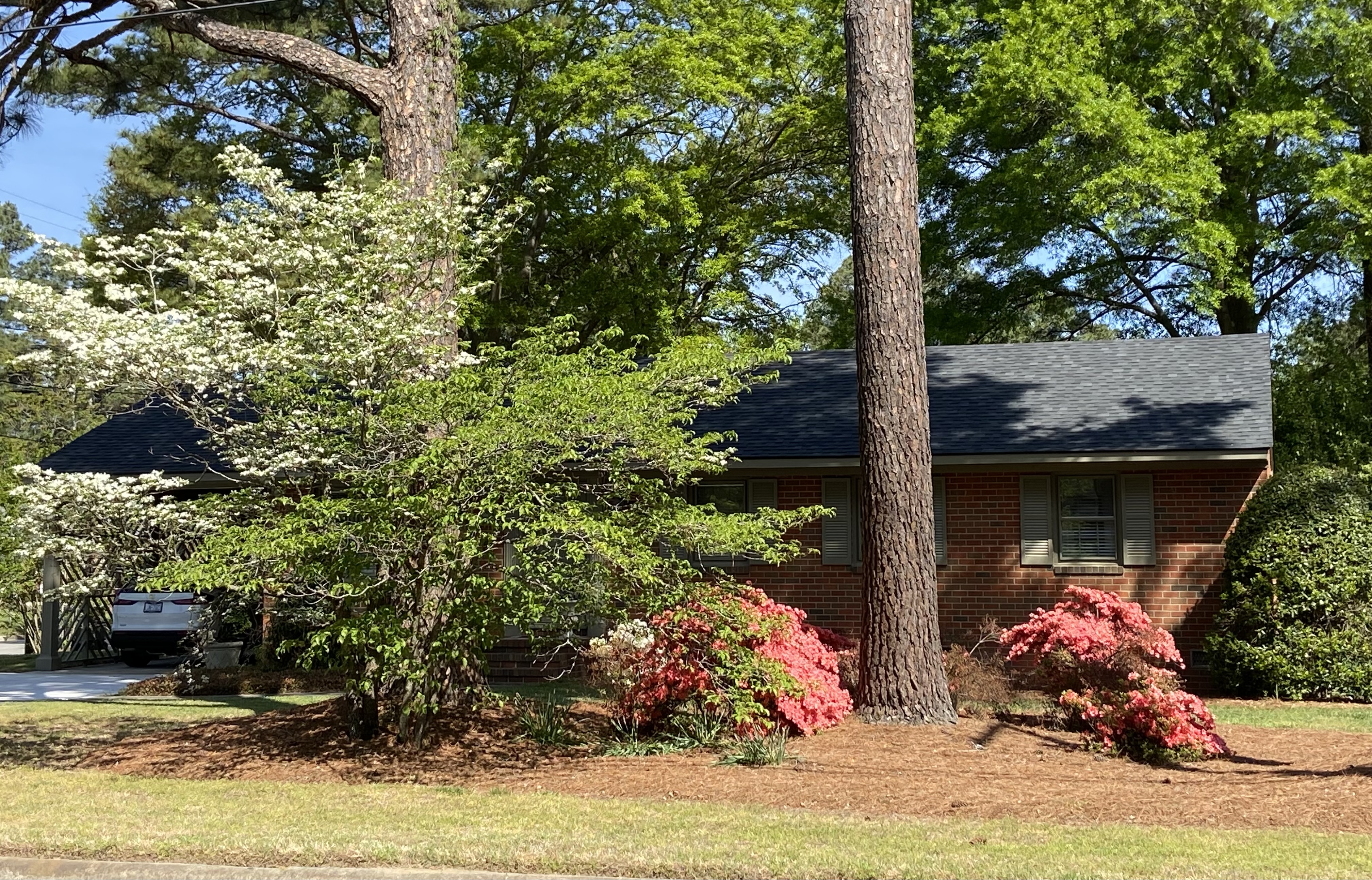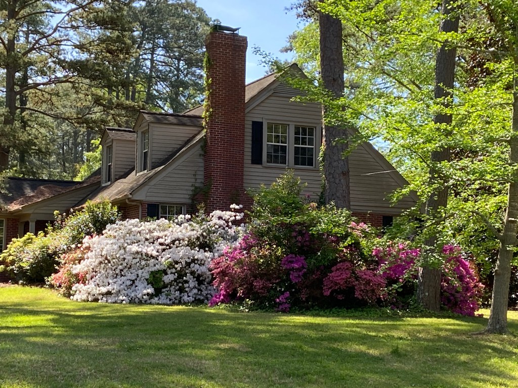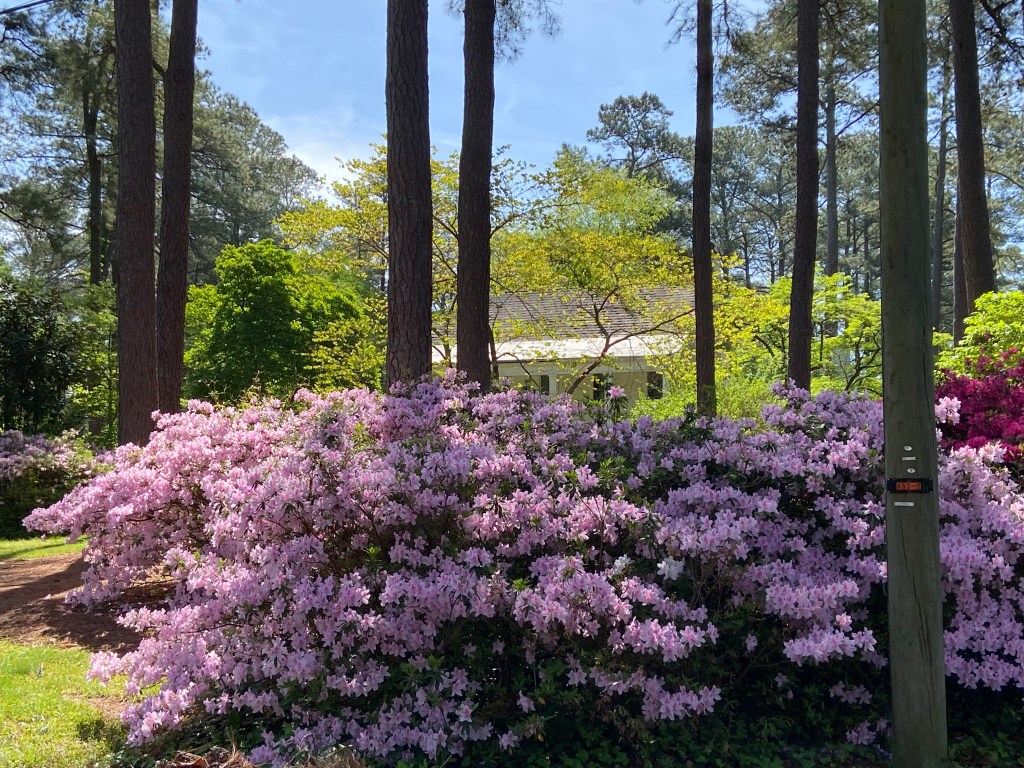 This display of azaleas coupled with a blooming dogwood tree caught my eye as I drove through the Englewood subdivision. After azaleas, a blooming dogwood tree is a close second in my book of favorite springtime beauties. And what’s more typical in eastern North Carolina than dogwoods and azaleas growing under tall, skinny pine trees.