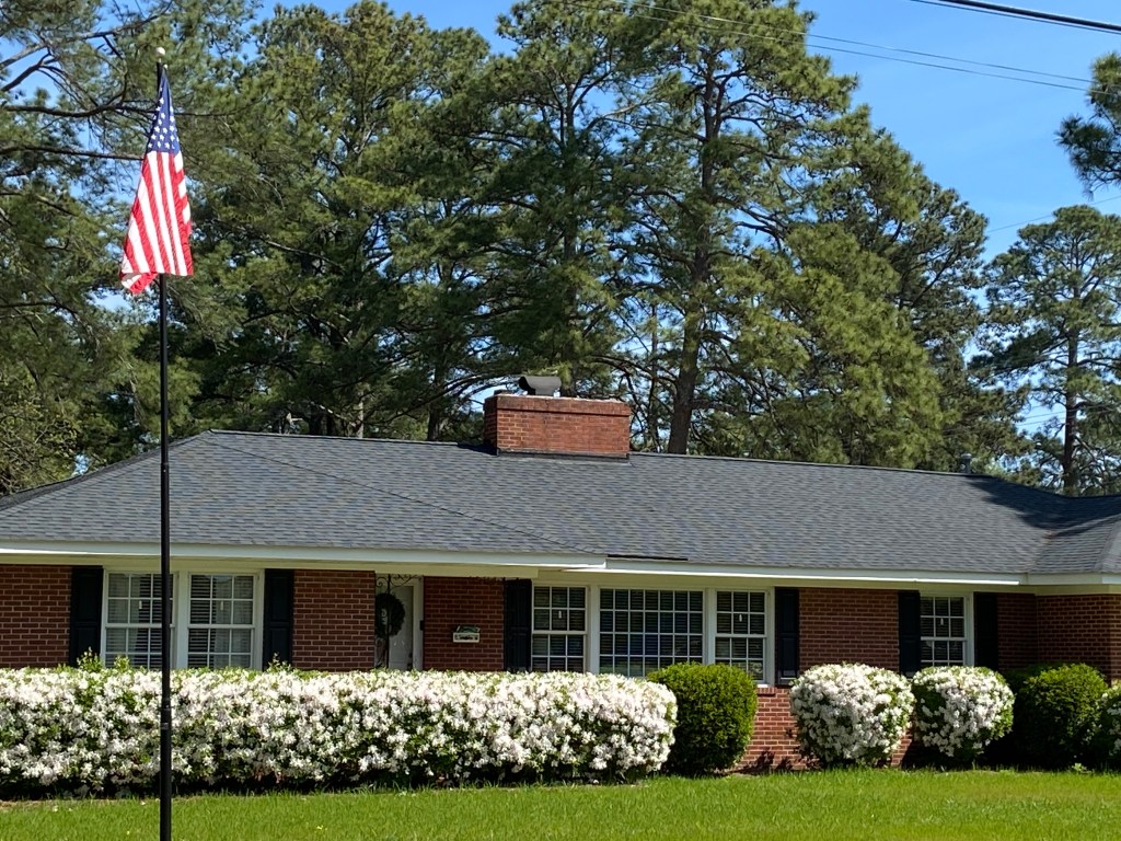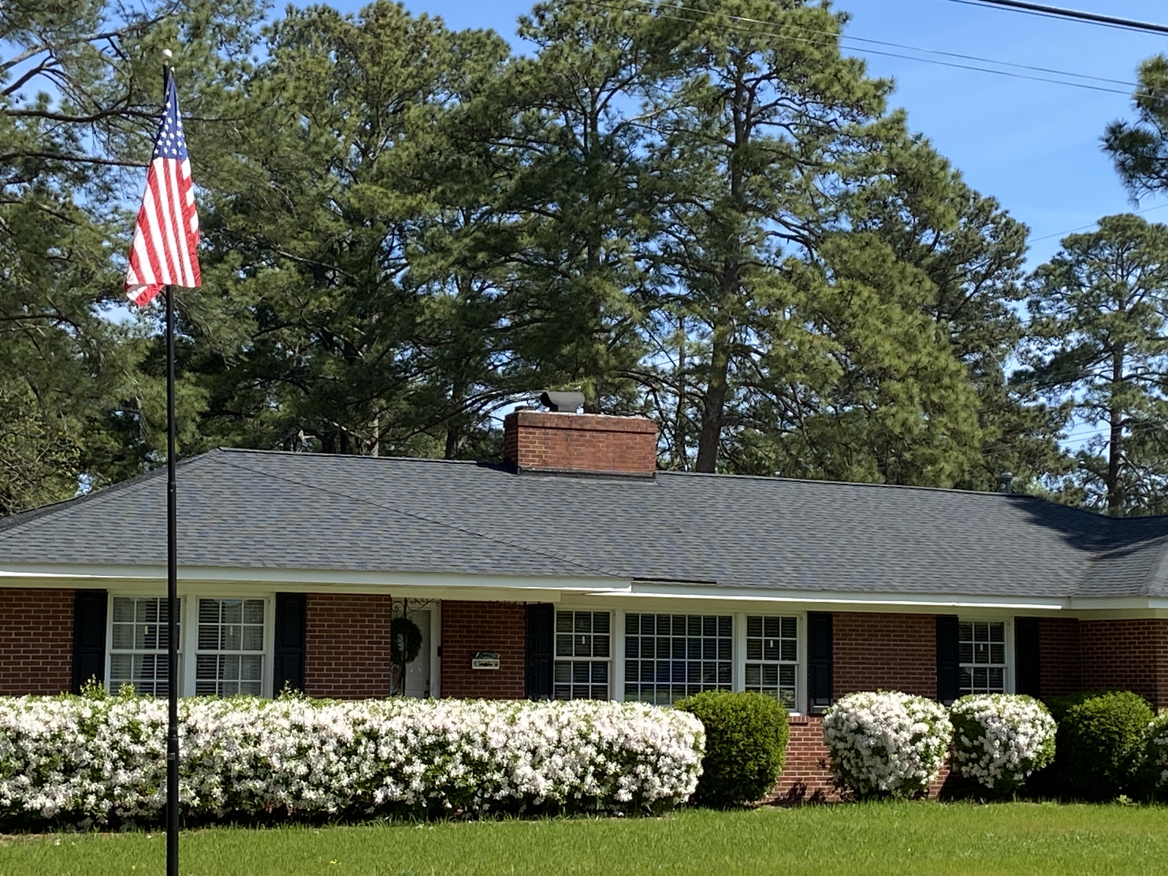 The residents of this house in the Westridge neighborhood use white azaleas for foundation shrubbery, just like my mother did years ago in front of our brick ranch out in Edgecombe County. Pretty! I also love the American flag on a very high pole in the yard.