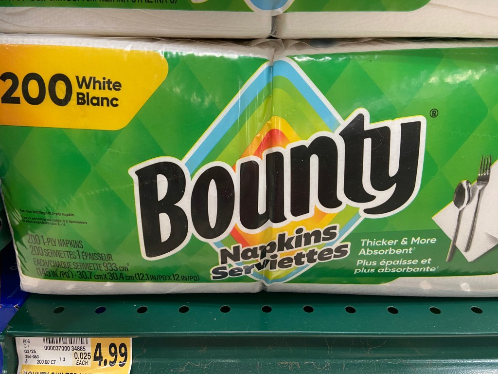 There’s really no need to look at bar codes when buying paper napkins. The number on the package tells the story. Why pay $4.99 for 200 Bounty napkins (even if they’re called “serviettes”) when you can buy the same number of Harris Teeter quilted napkins for $3.79?