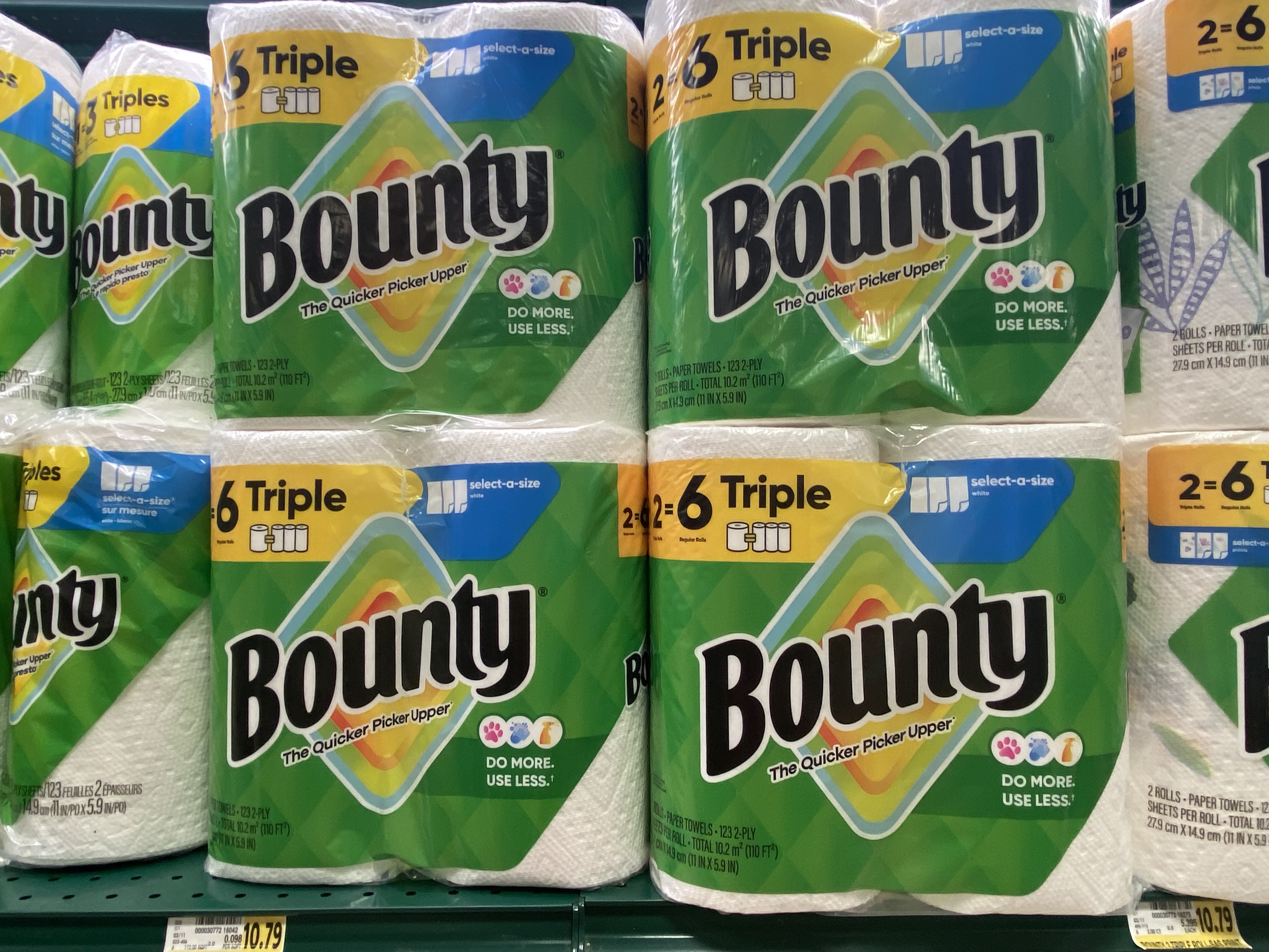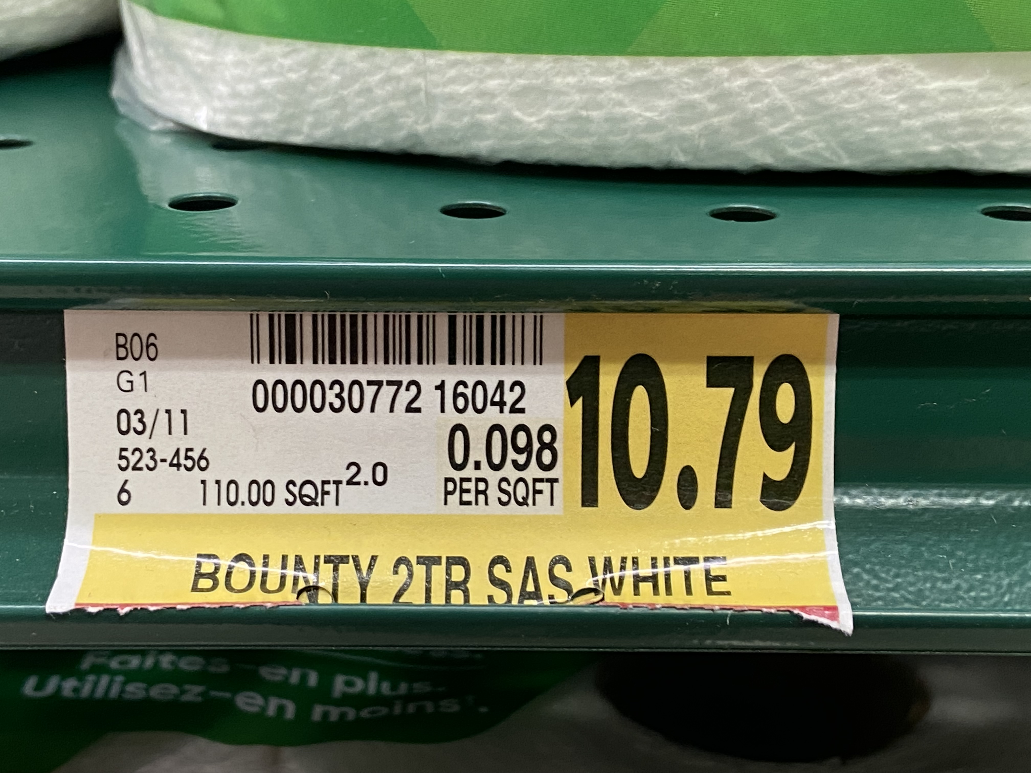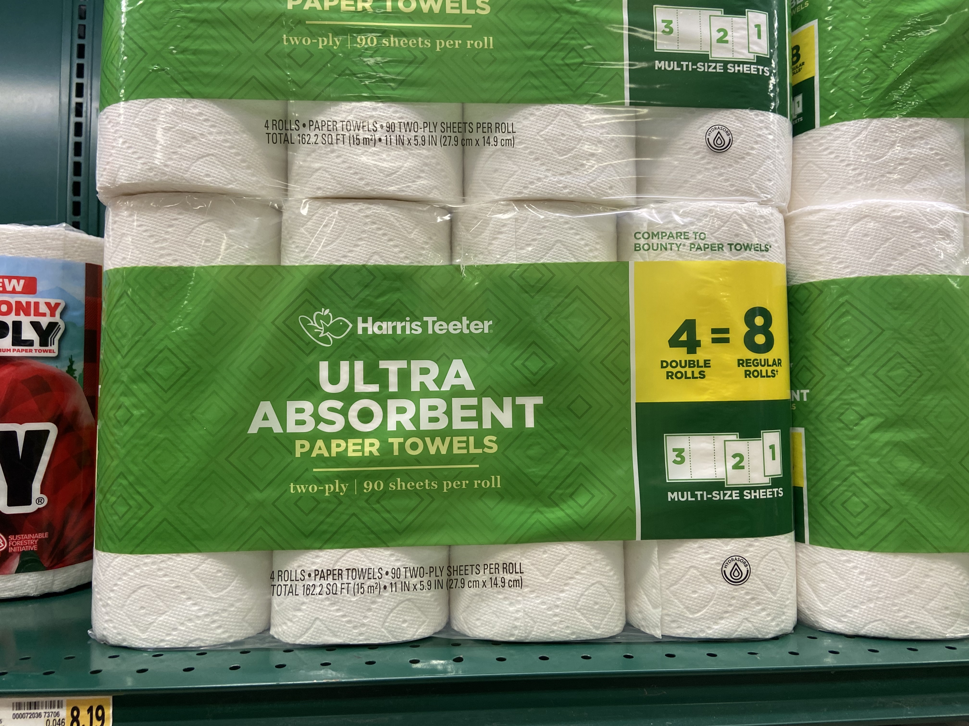 Bounty paper towels are 0.098 per SQFT (square foot). The Harris Teeter brand is less than half that price at 0.046. Bounty may be the “Quicker Picker Upper” but I’m buying Harris Teeter pick-a-size paper towels.