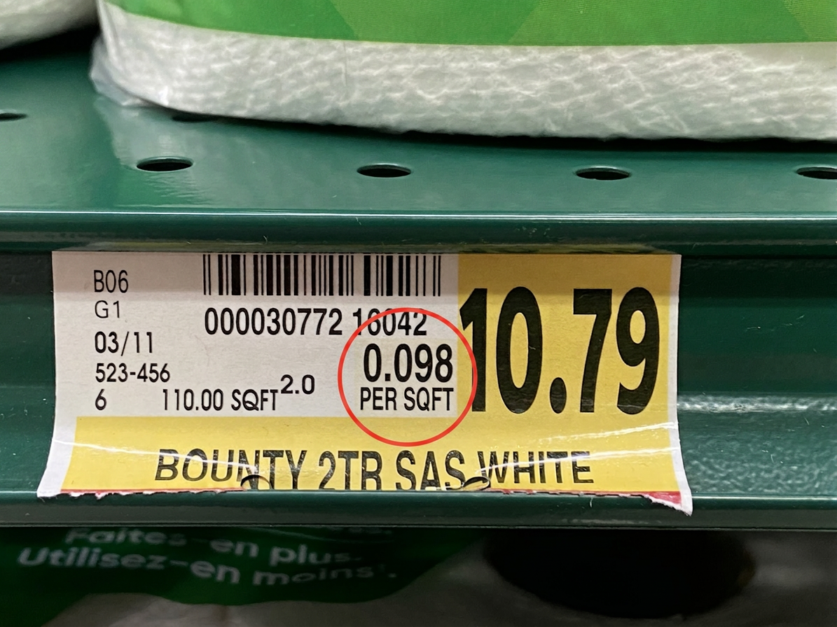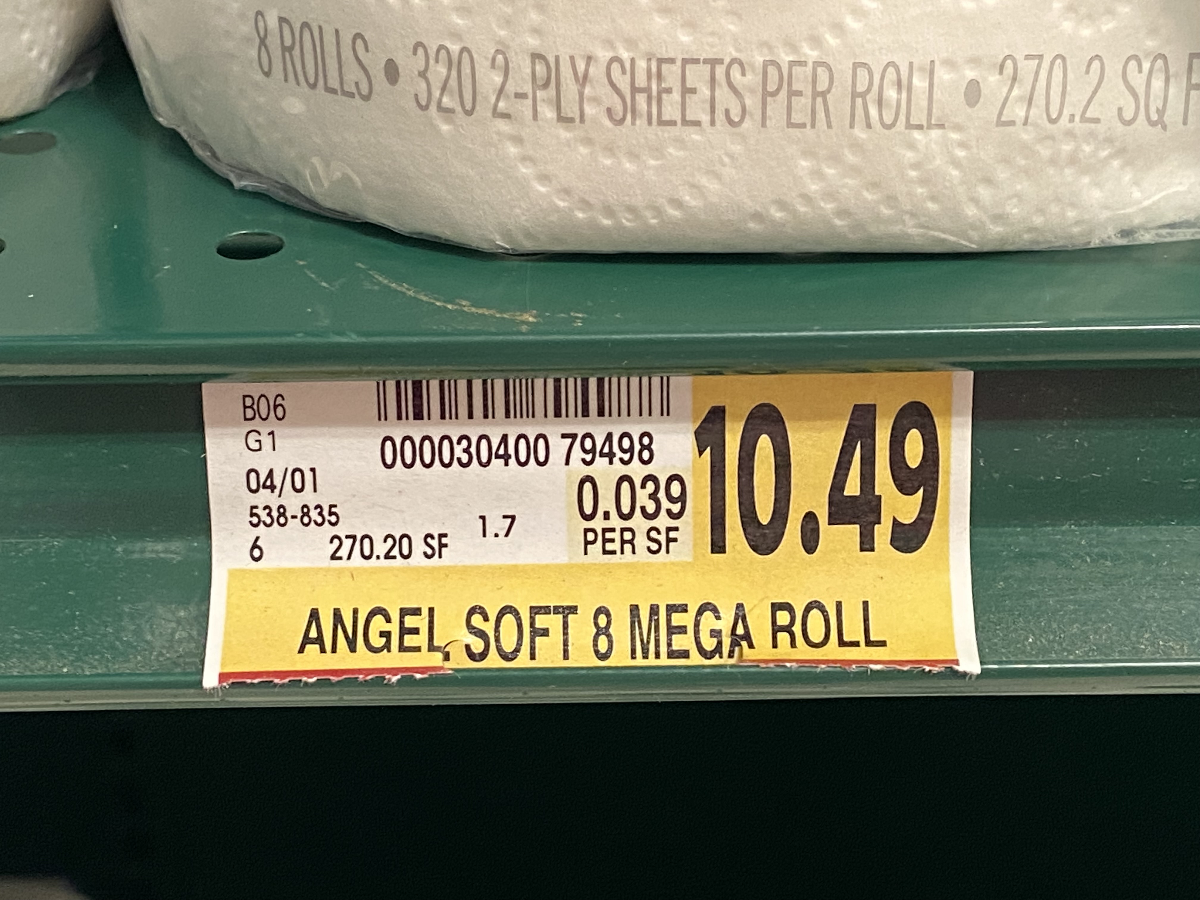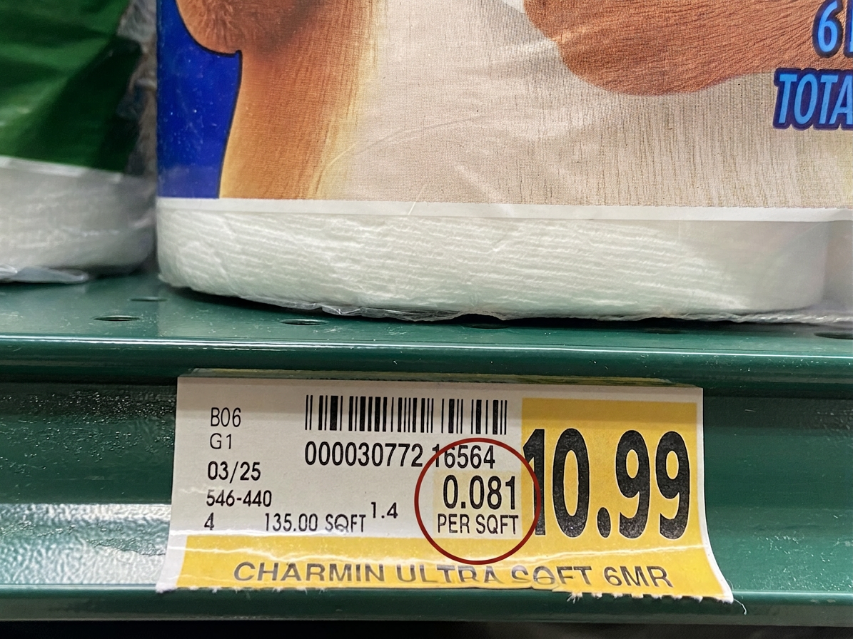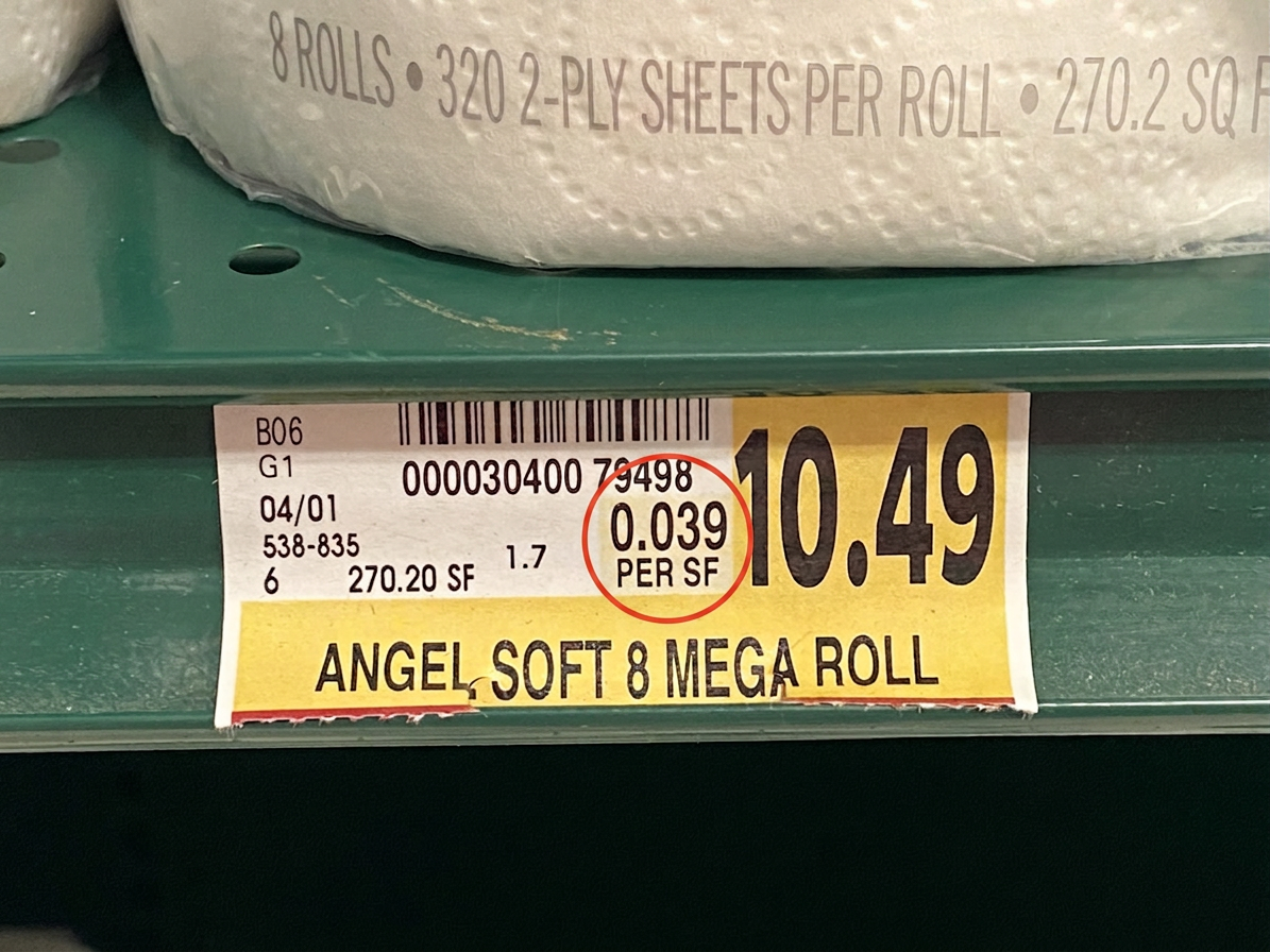 For example, this week at Harris Teeter, a package of six-mega rolls of Charmin is 0.081 per SQFT (I assume that means square foot). The 8-mega roll of Angel Soft, without the sale price, is 0.039 per SF (square foot). Charmin costs 0.042 cents more per square foot than Angel Soft at its regular price. These are the numbers that count.