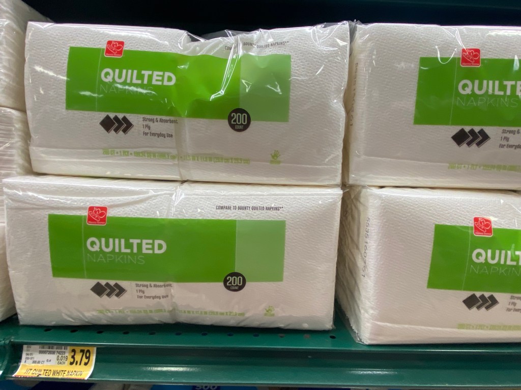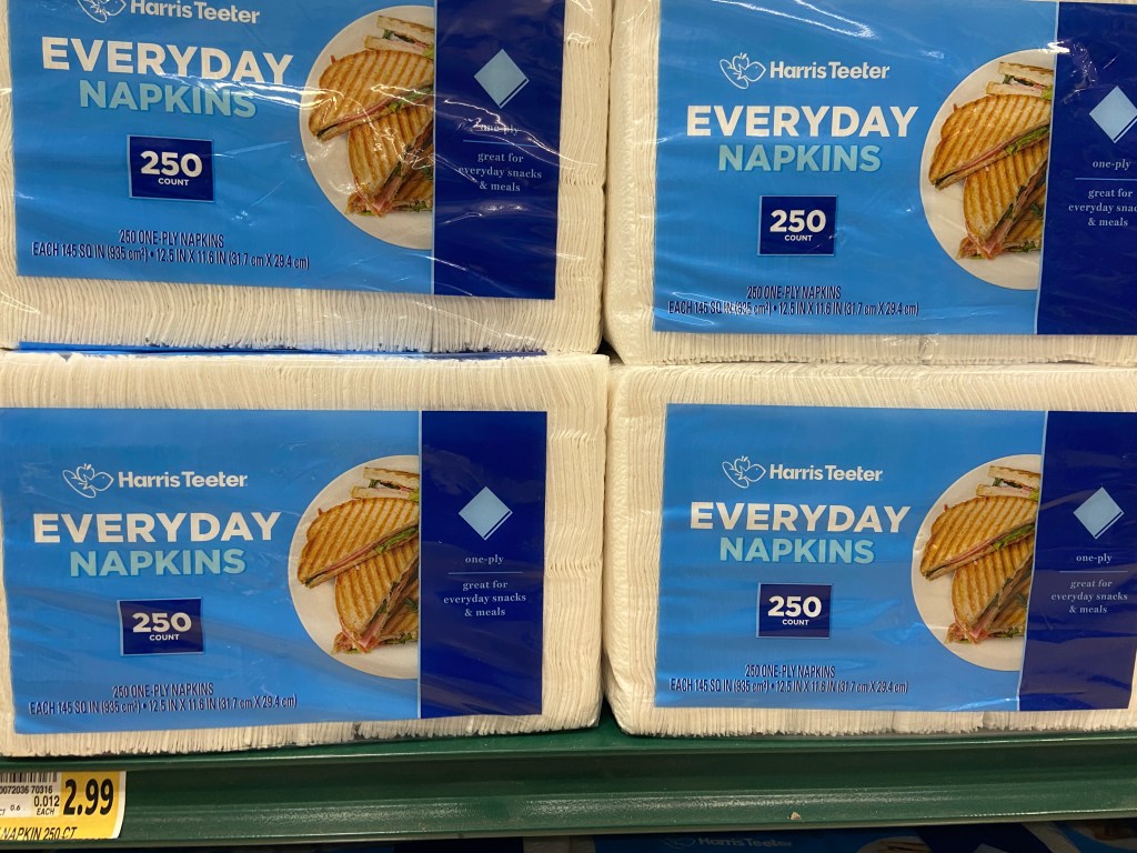 I go even cheaper and purchase the Harris Teeter everyday napkins. Fifty more napkins and 80 cents less than the Harris Teeter quilted type.