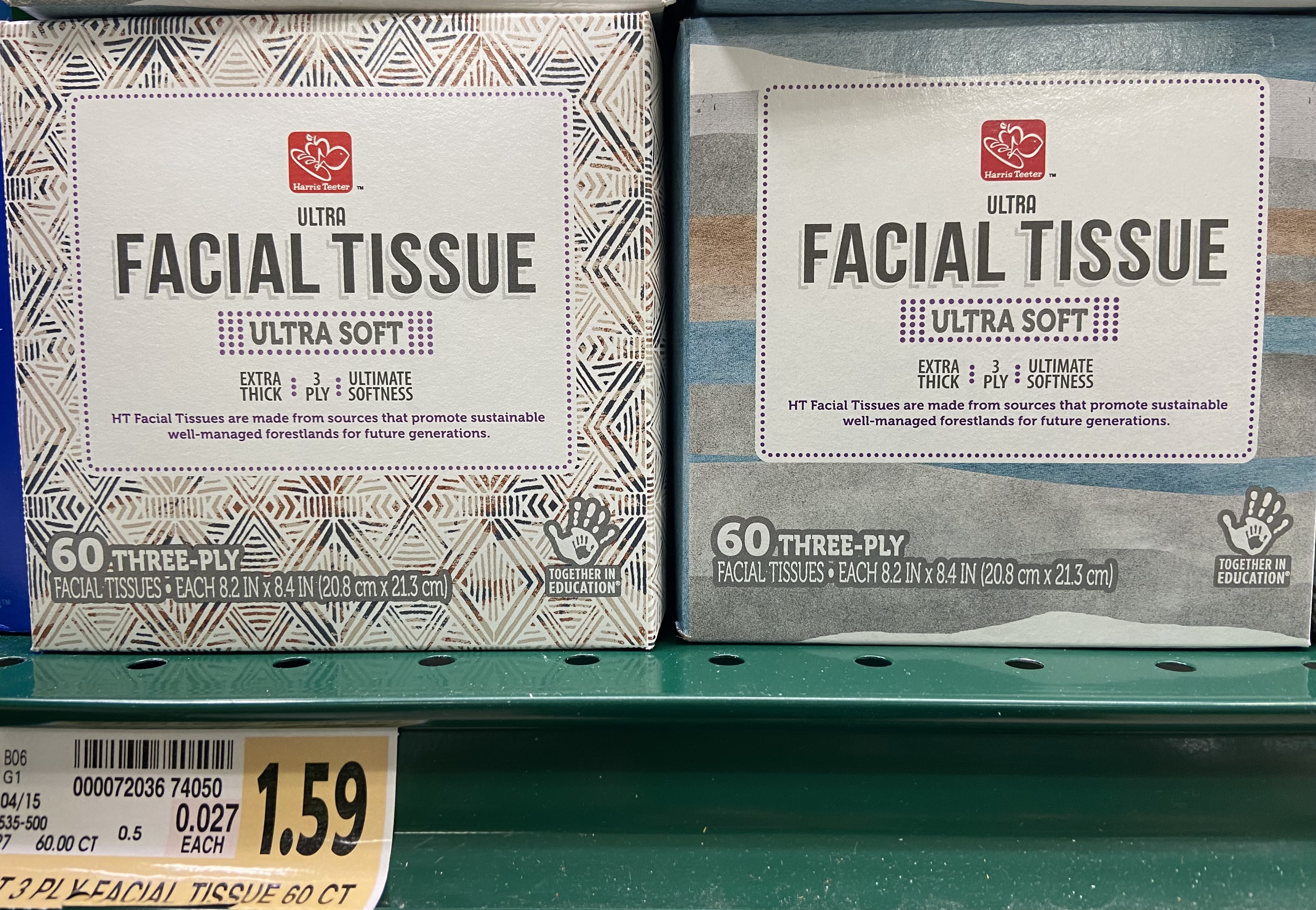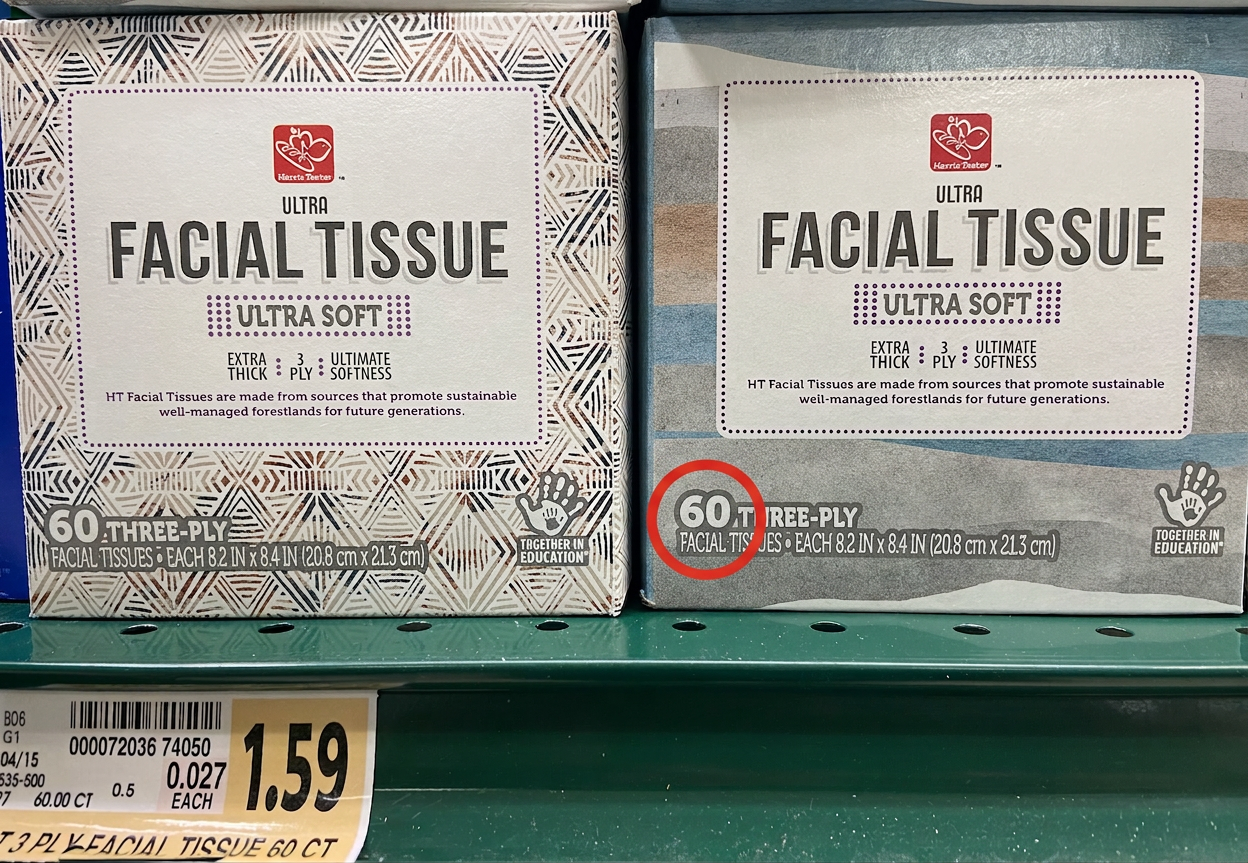 Both Kleenex and the Harris Teeter brand contain 60 tissues in each box. Guess which one I’m buying?