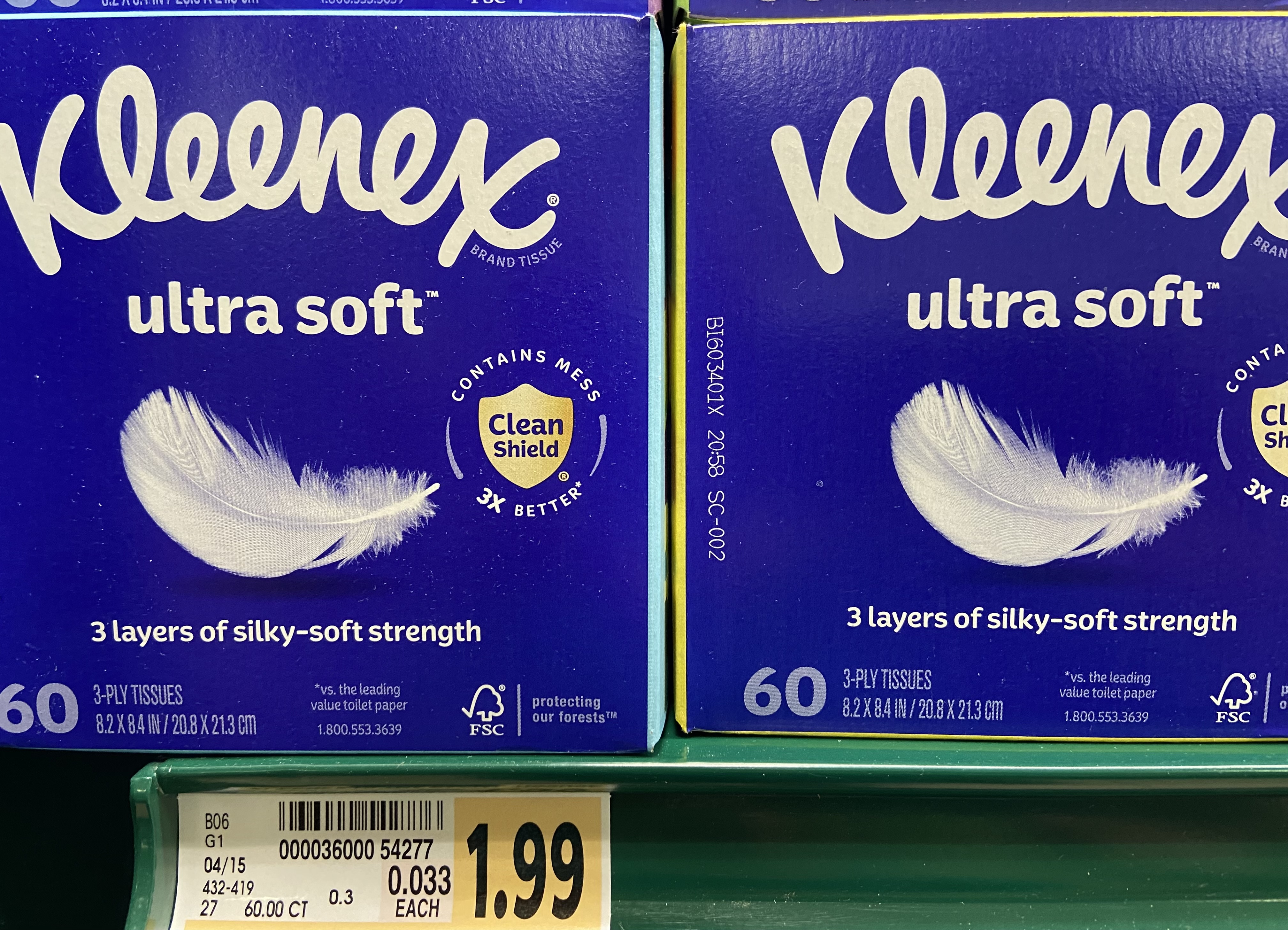 One final paper product to analyze: facial tissue or–to call it what’s actually a brand name–Kleenex. As with napkins, what you need to look at is the number stated on the box.
